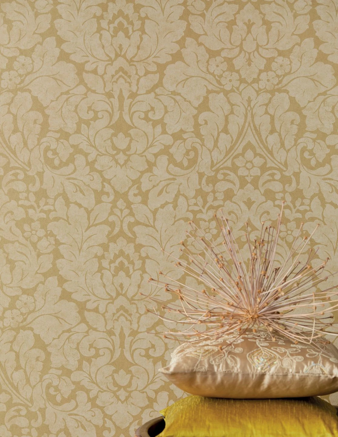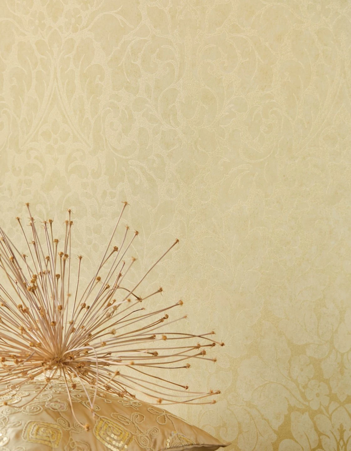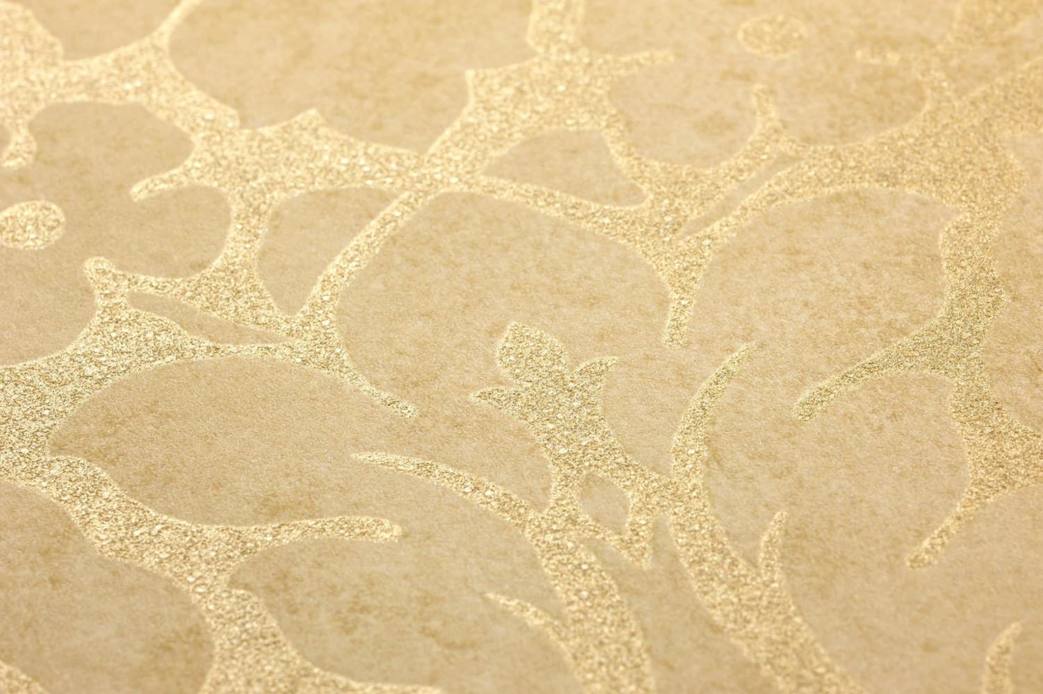 Der golden schimmernde Untergrund verleiht den hellbeigen floralen Musterornamenten eine erhabene Schönheit. Diese Barocktapete liebt es ohnehin schillernd und glänzend, weshalb Sie mit Farben wie Gold, Gelb und Champagner würdige Stylepartner auswählen. Edle Hölzer unterstreichen den brillanten Look.