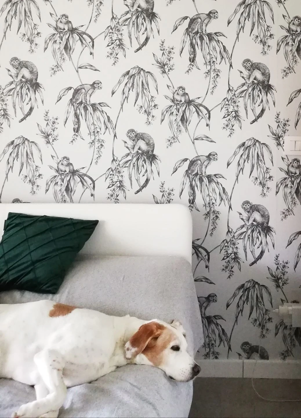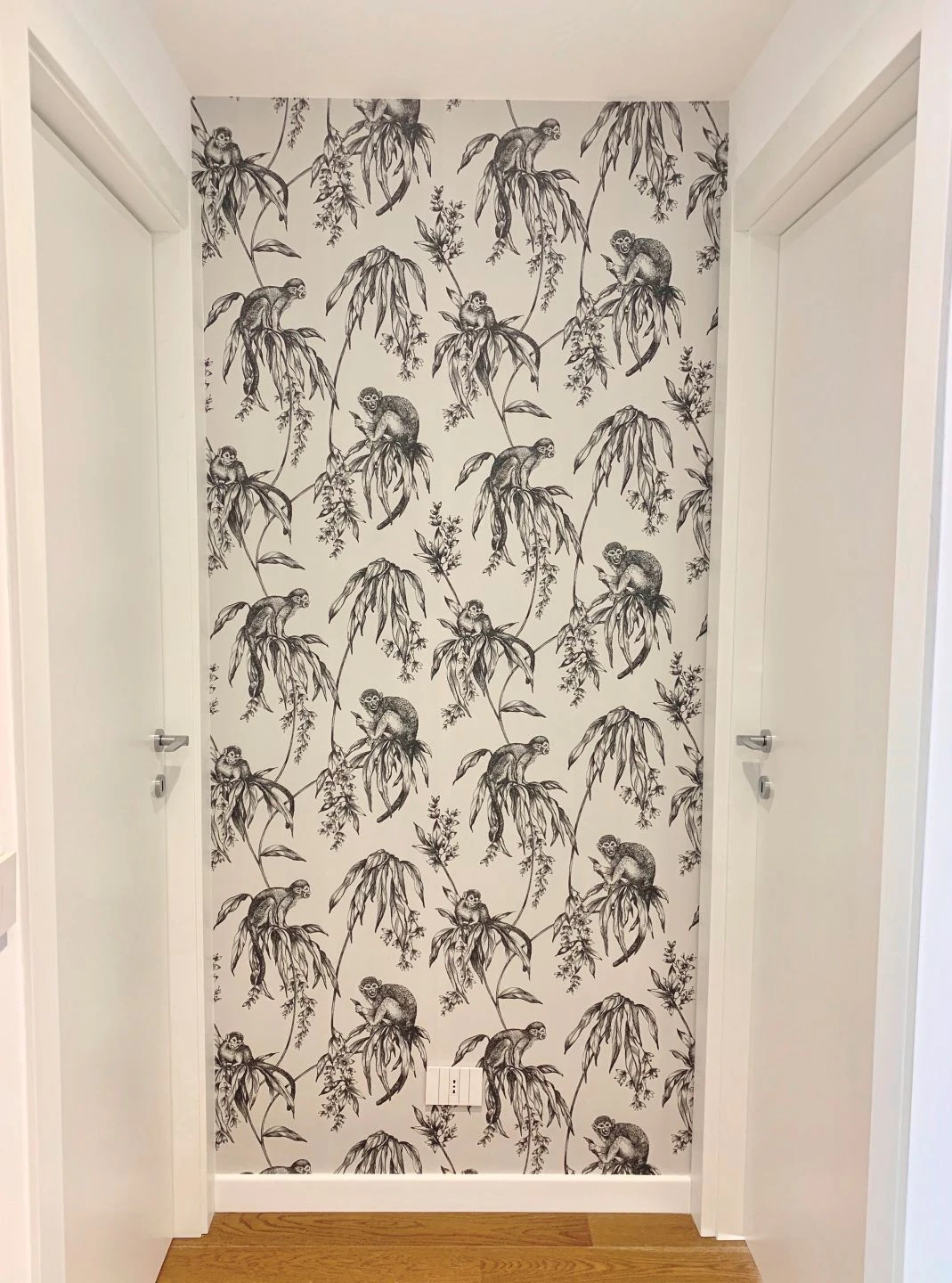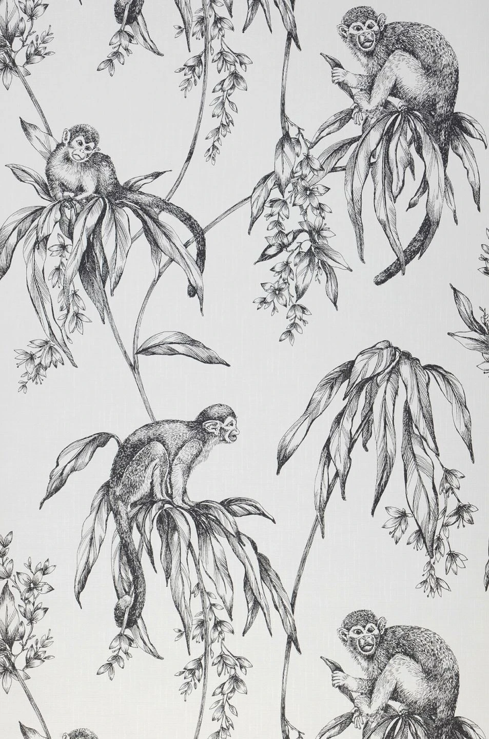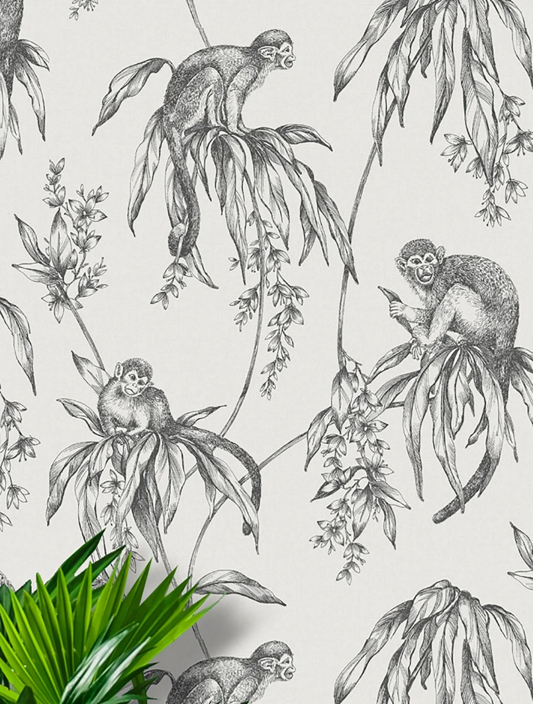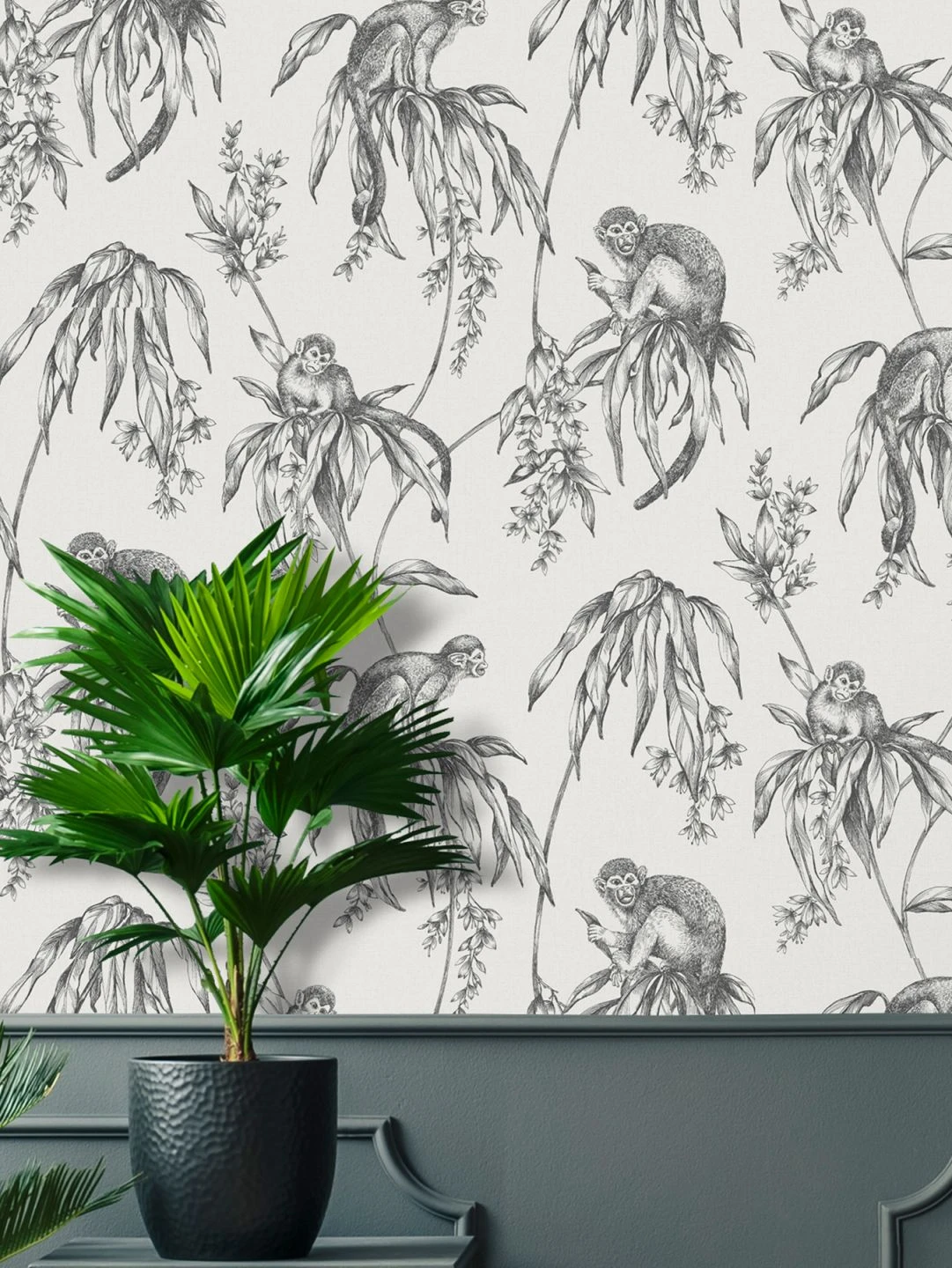 Das tropische Muster gefällt sich in Grauweiss und Schwarzgrau und lässt dabei keine Farbigkeit vermissen, denn die ist in Gedanken individuell präsent. Das ausgefallene Design der robusten und abwaschbaren Vinyltapete weist eine feine Struktur auf, die das Fellkleid der lustigen Affen geradezu spürbar macht.