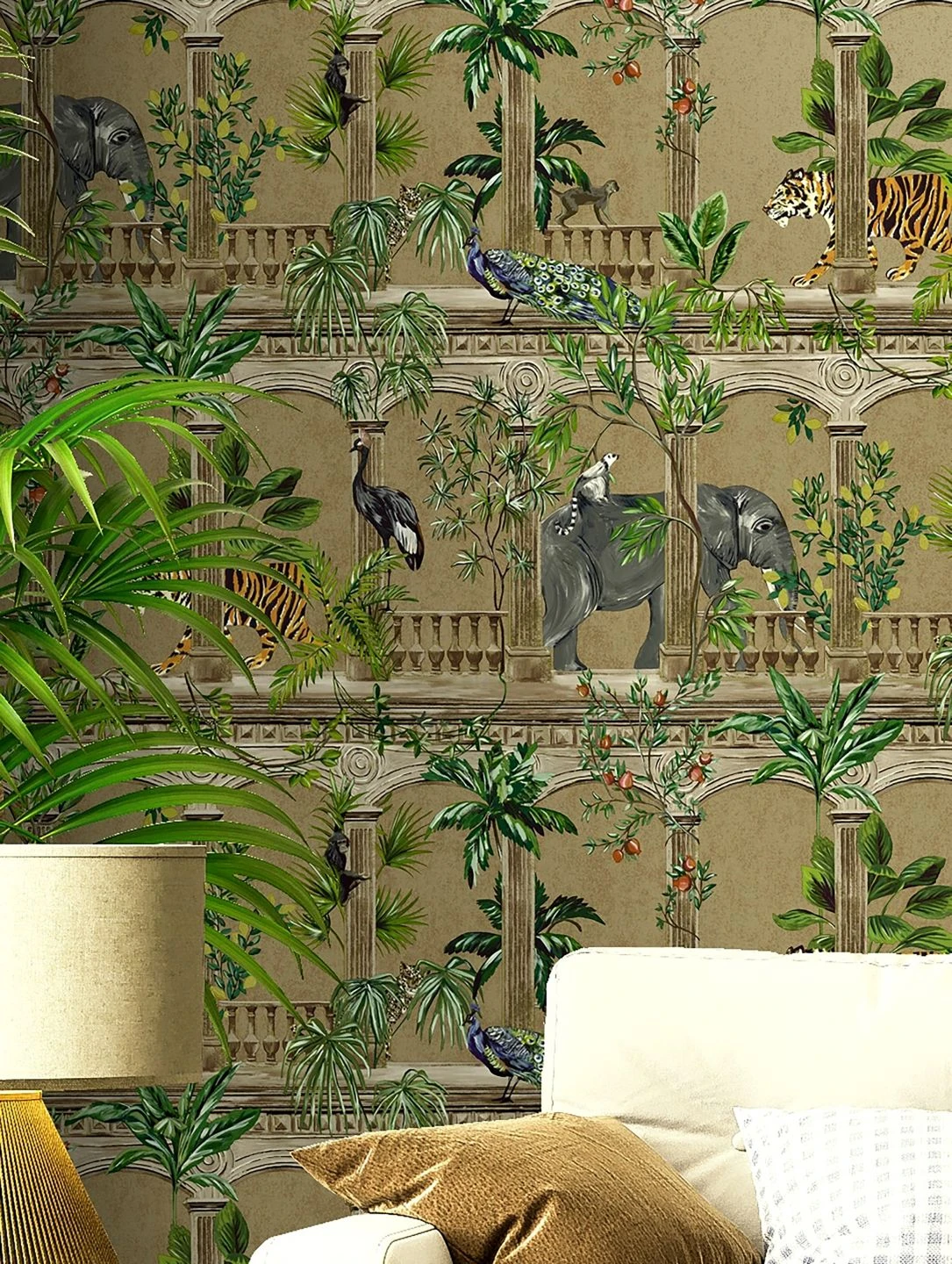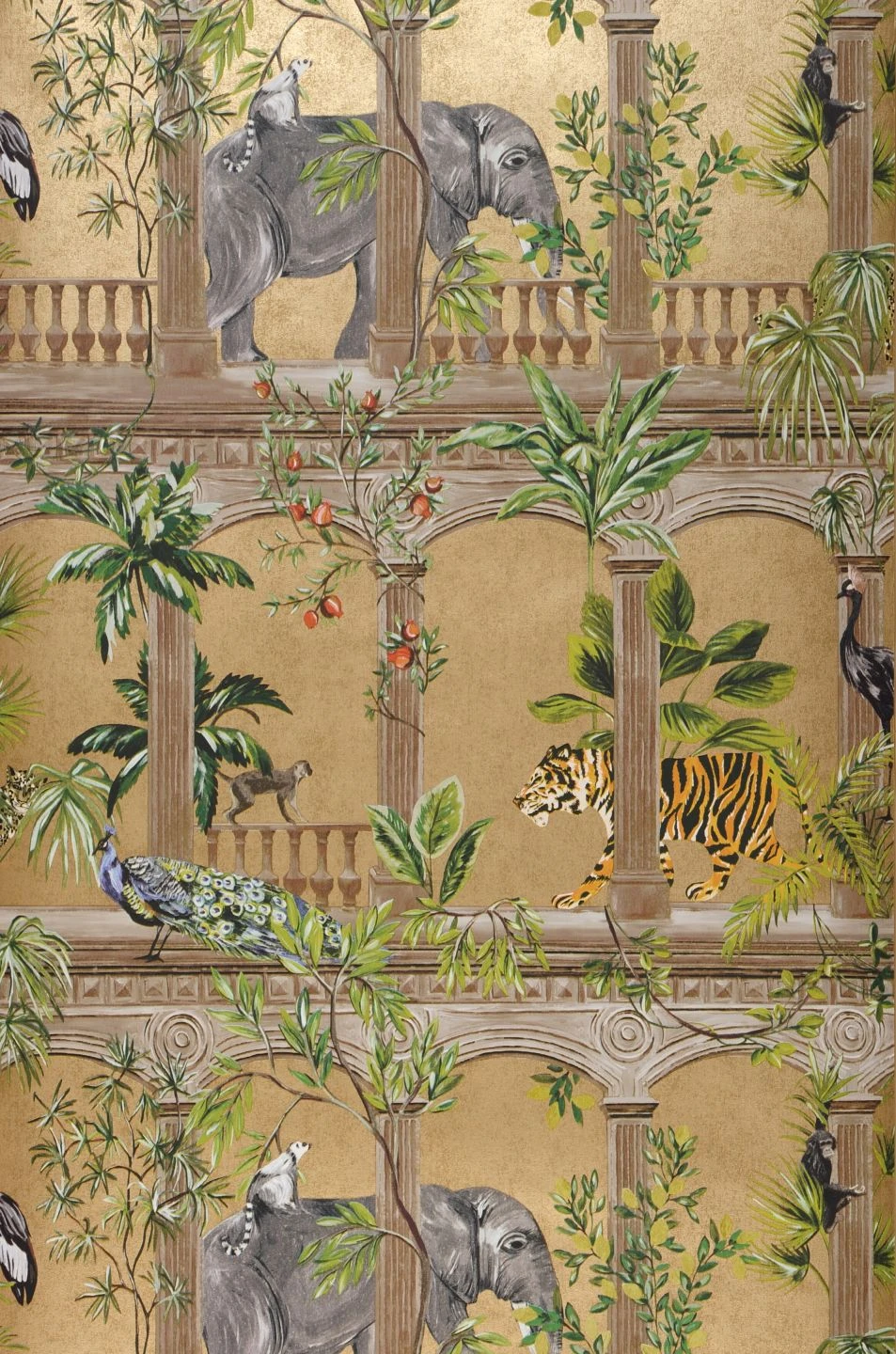 Luxuriös und exotisch verwandelt Lunasa mit ihren detailreichen Abbildungen Ihren Raum in die Suite eines orientalischen Palastes. Auf perlgoldfarbenem Grund sind zwischen Säulen, Balustraden und verschiedenen Palmen und Sträuchern Elefanten, Tiger, Affen und Pfauen zu sehen. Das schimmernde Perlgold lässt die Vliestapete besonders edel wirken und bietet einen tollen Hintergrund für die lebendige Vielfalt der Illustrationen.