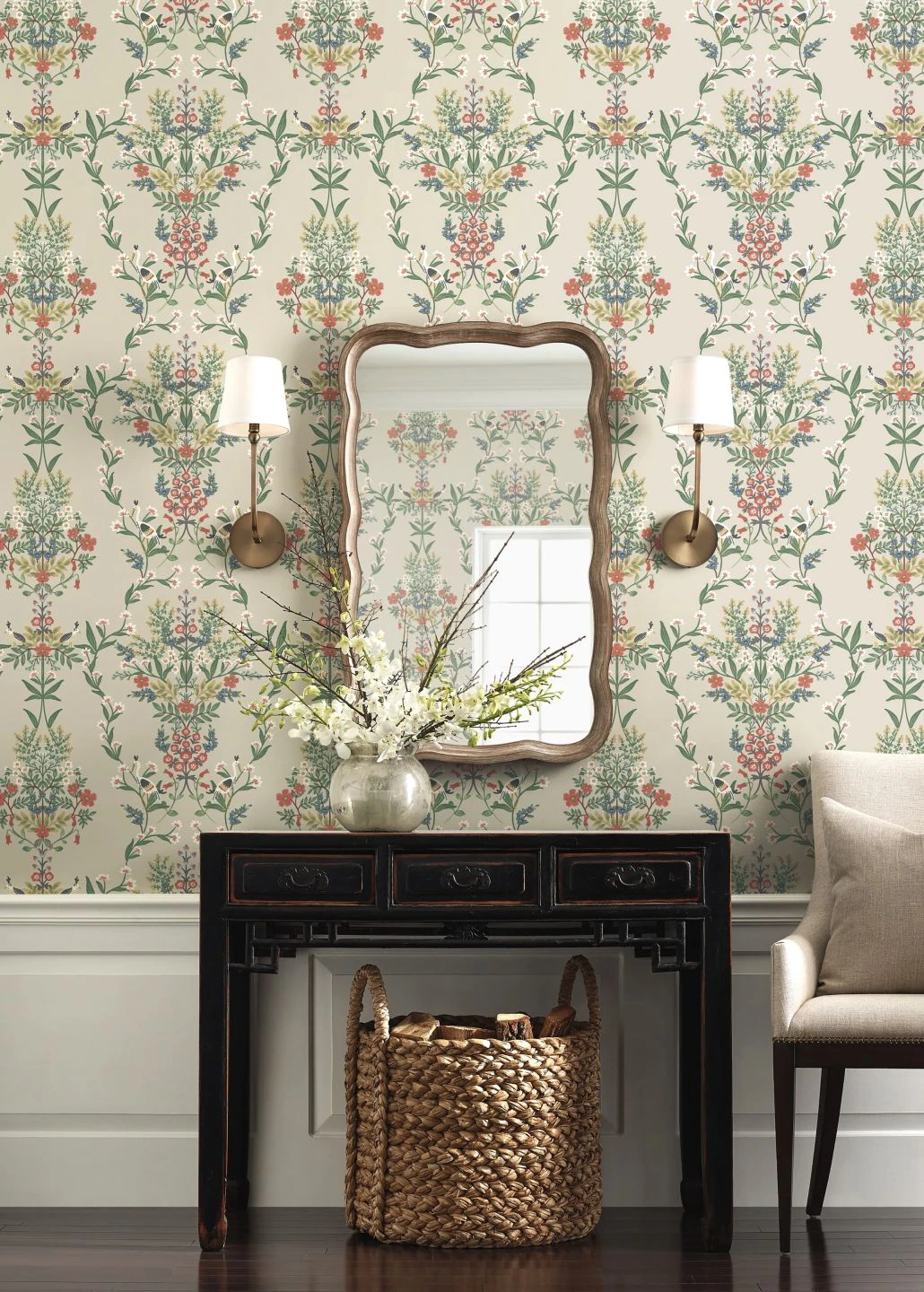 Luftig und beinahe schwerelos wirken die kunstvoll arrangierten Blumenbouquets und Blütenranken auf der außergewöhnlich schönen Papiertapete Luxembourg von Rifle Paper. Alle Farben harmonieren miteinander und wurden so gewählt, dass sie zusammen mit dem kieselgrauen Grund einen Hauch von Vintage-Romantik ausstrahlen. Die zarten Blumen und Vögel des Musters werden durch Details in schimmerndem Perlgold wirkungsvoll betont.