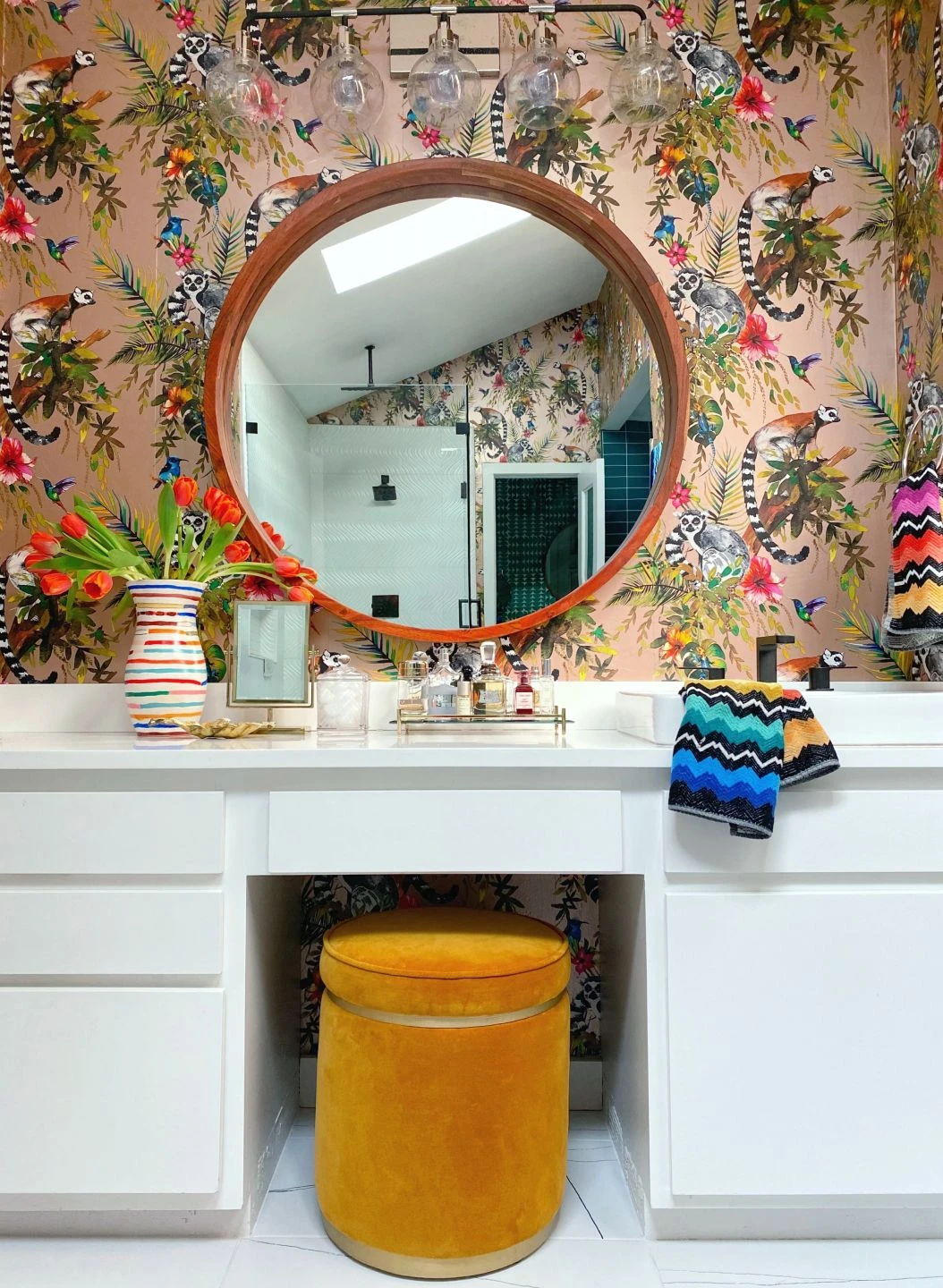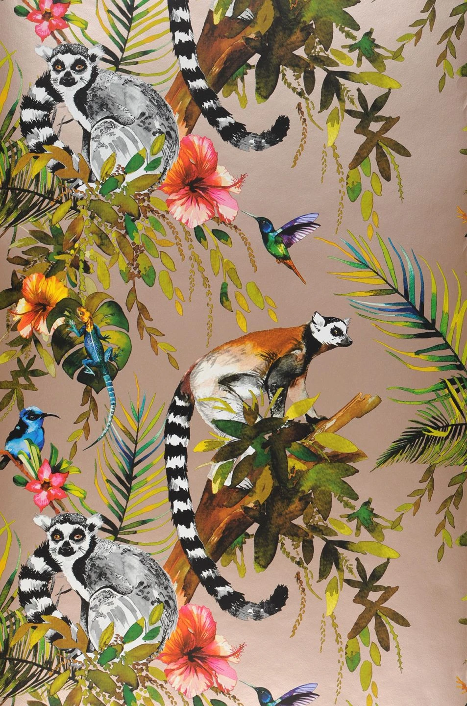 Kilometerlange Alleen mit mächtigen Baobabäumen, exorbitante Felswände, tropischer Regenwald, exotische Tiere. Die unbändige Schönheit der ältesten Insel im Indischen Ozean erblüht mit dieser ausgefallenen Motivtapete auch in den eigenen vier Wänden. Schimmerndes Rosenholz bildet den aufregenden Fond für die spritzigen Musterfarben Blau, Braun, Gelb, Rosa und Grüntöne.