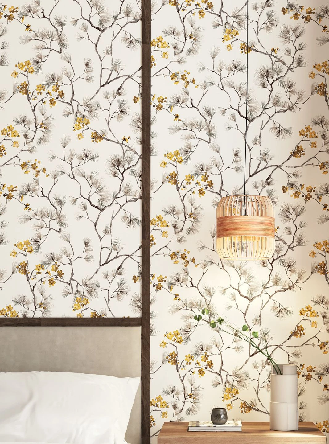 Mit feinen Pinselstrichen gezeichnete Nadelbaumzweige, betont durch leicht schimmernde Glanzlichter von Perlbeige, und leuchtend maisgelbe Blüten auf schlichtem cremeweißem Untergrund kreieren einen Wandschmuck, der perfekt zum klaren asiatischen Einrichtungsstil passt. Die Vliestapete „Makino“ wirkt frisch und leicht und bringt sonniges Leuchten und orientalische Freundlichkeit in Ihren Raum.