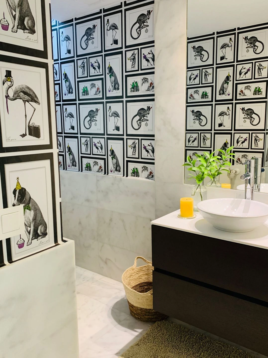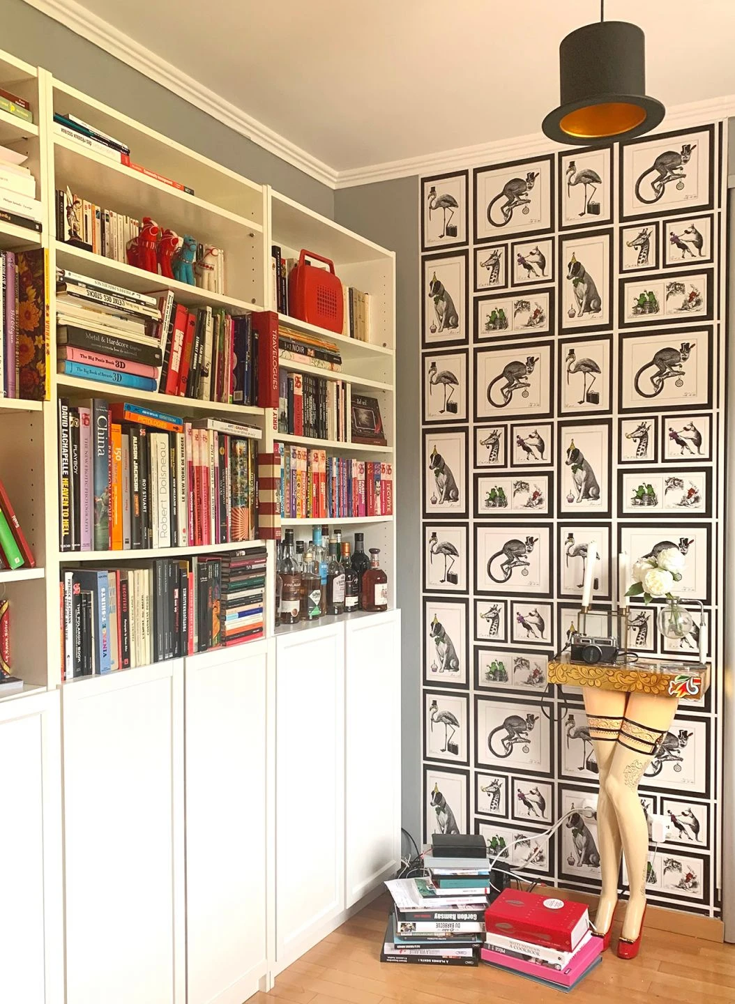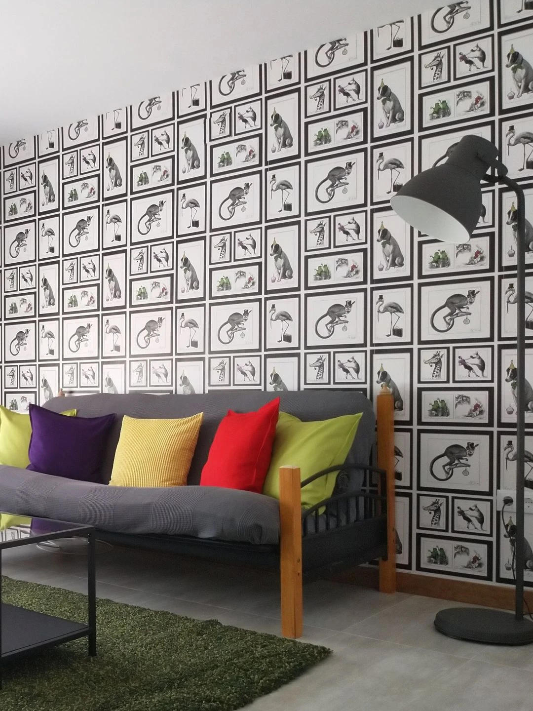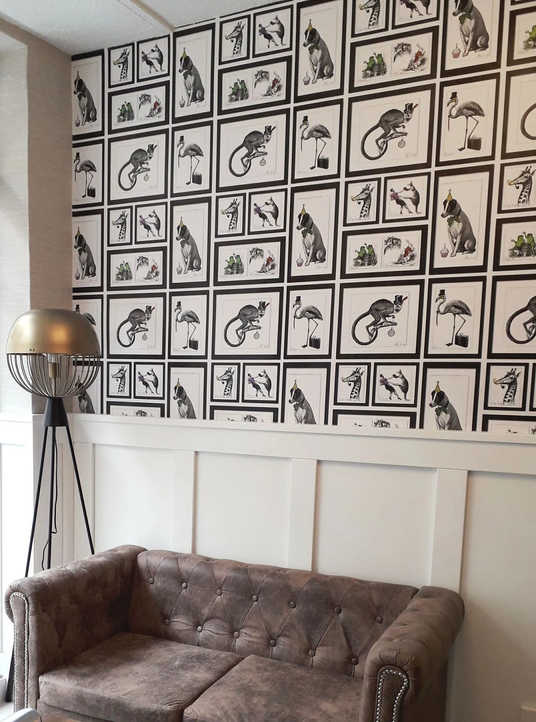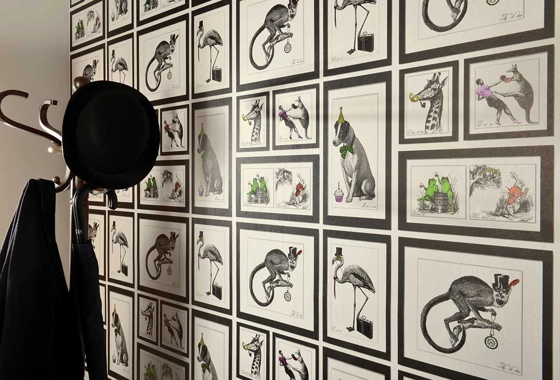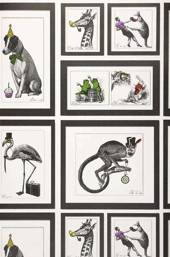 Wie ein Sammelsurium von schwarz gerahmten Kupferstichen bebildert „Maleme“ Ihre Wand mit Abbildungen von Tieren mit ungewöhnlichen Accessoires. Von einem Flamingo mit Aktenkoffer und Melone über eine Giraffe mit Tabakpfeife bis zu einem boxenden Känguru sind witzige Kuriositäten zu entdecken. Details in leicht schimmernden Farben unterbrechen die schwarzweiße Anmutung der extravaganten Papiertapete und ziehen den Blick auf sich.