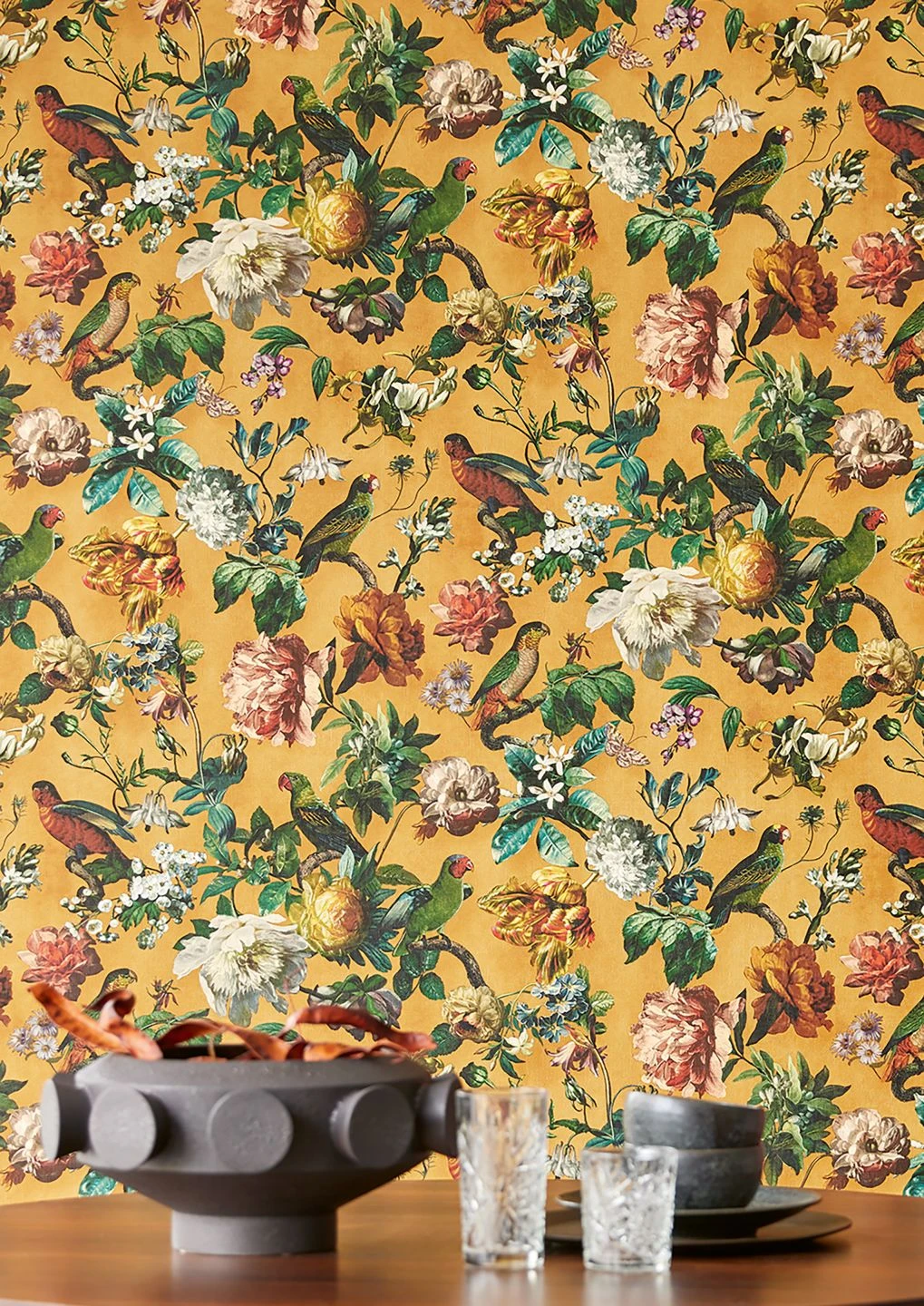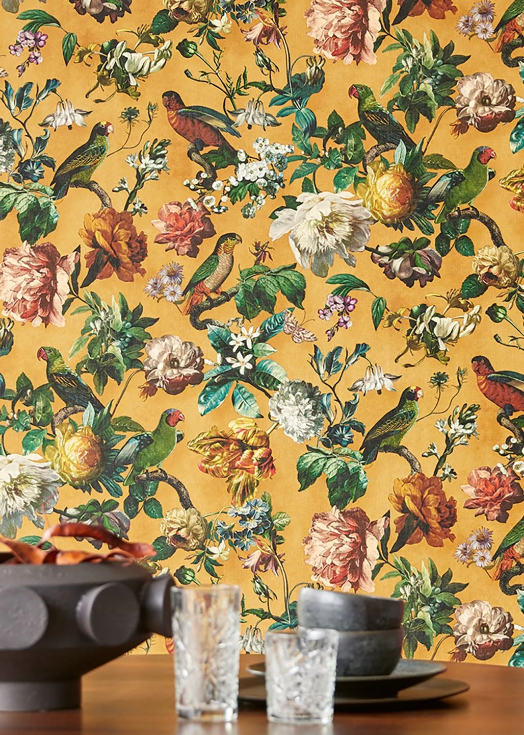 Auf dem kräftig leuchtenden, ockerfarbenen Grund schmücken meisterhaft gemalte Vögel, Blumen, Blätter und Schmetterlinge Ihren Raum. Durch die textilähnliche Struktur der Vinyloberfläche wirkt „Margarete“ wie ein kostbares Gemälde. Gleichzeitig macht das Vinyl die farbenprächtige Vliestapete hoch waschbeständig. So können Sie jeden beliebigen Raum damit verschönern und zu einer Besonderheit machen – sogar Ihr Badezimmer.