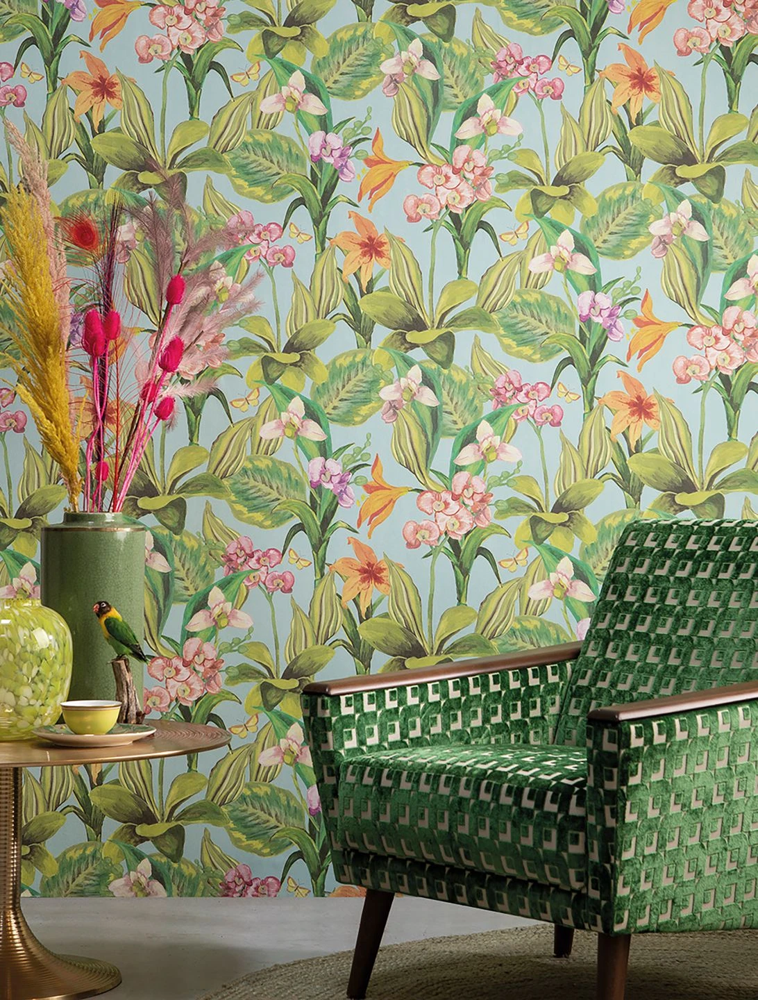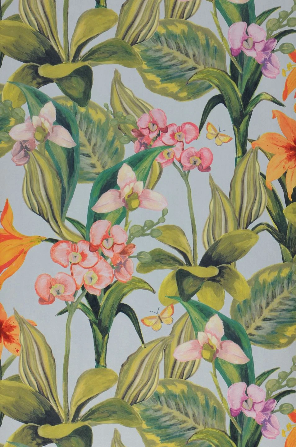 Dass die Orchidee als Königin unter den Blumen bezeichnet wird, bringt die Vliestapete Marianne perfekt zum Ausdruck. Die fantastisch geformten Blüten und die kräftig grünen Blätter der beliebten Blumen machen Ihren Raum zu einer wahren Augenweide. Orange- und Rosatöne auf zartblauem Grund schaffen frühlingshaftes Strahlen – unterstützt von den kleinen Schmetterlingen, die bei genauem Hinsehen zwischen den prächtigen Orchideen zu entdecken sind.