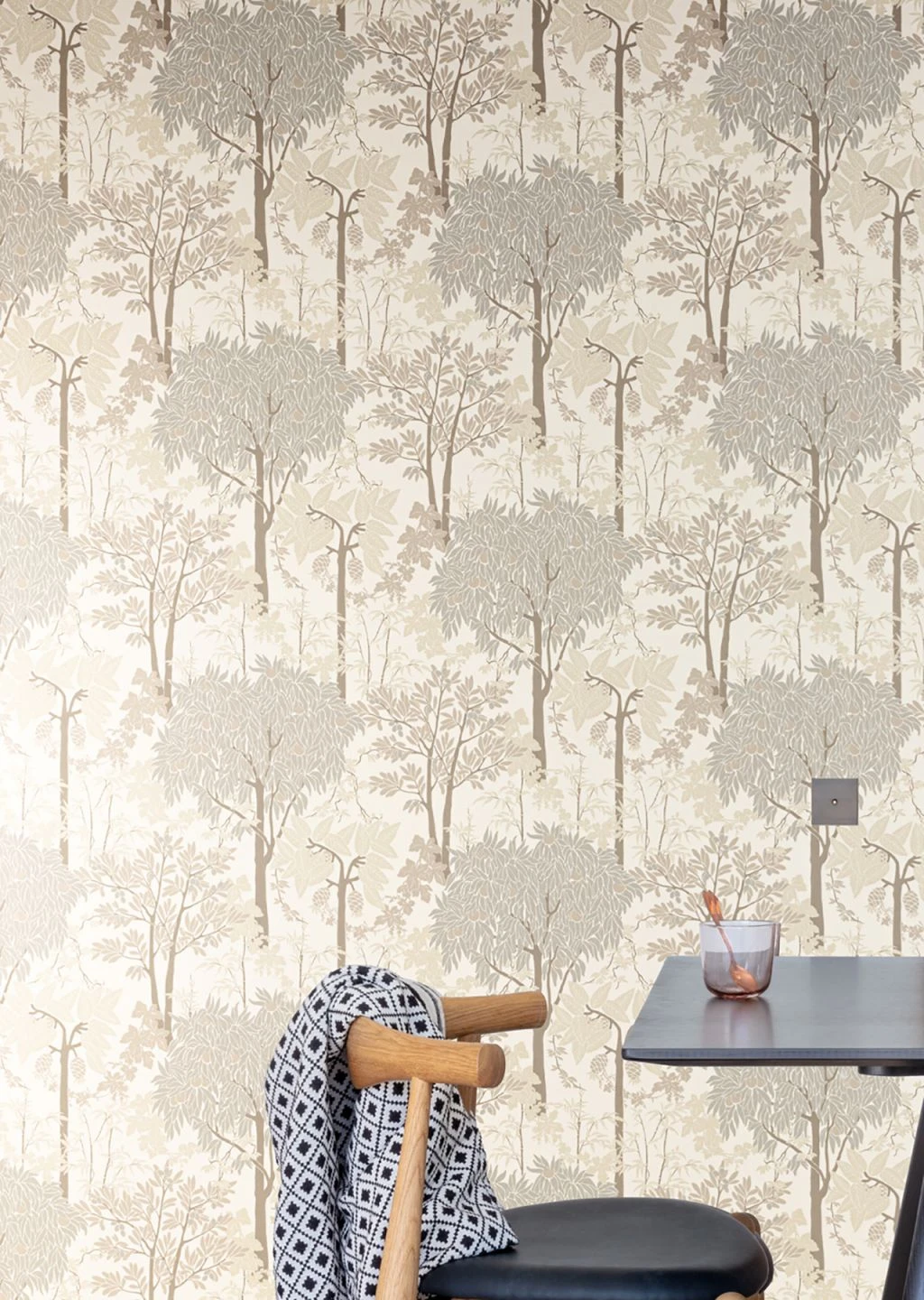 Die ästhetische Wirkung der Vliestapete beruht auf der ausgewogenen Harmonie zwischen den hellen Grau- und Beigetöne, die das Muster ausmachen. Ein heller Wald mit schlanken Bäumen, rankenden Zweigen, Früchten und verschieden geformten Blättern vereint den Eindruck von Lebendigkeit mit dezenter Zurückhaltung. Braun- und Grautöne sind die perfekten Begleiter für diesen Wandschmuck.