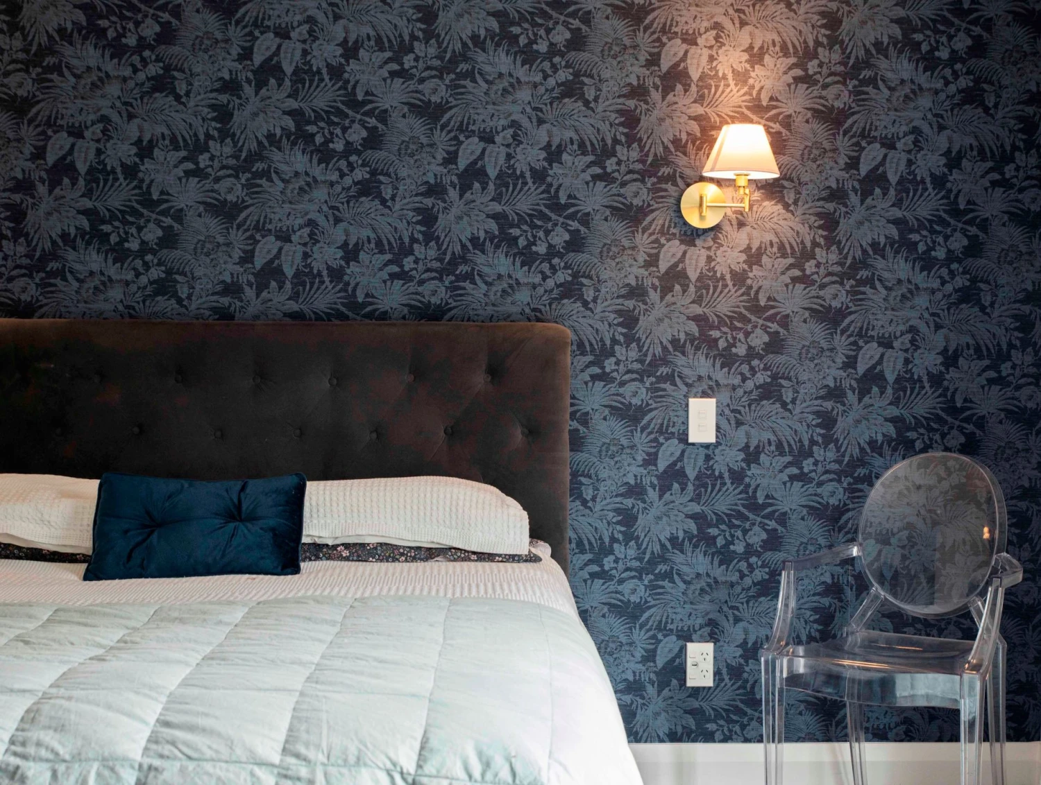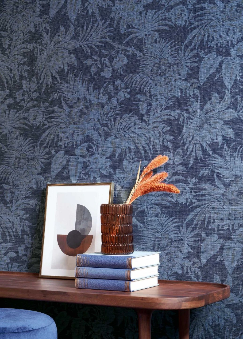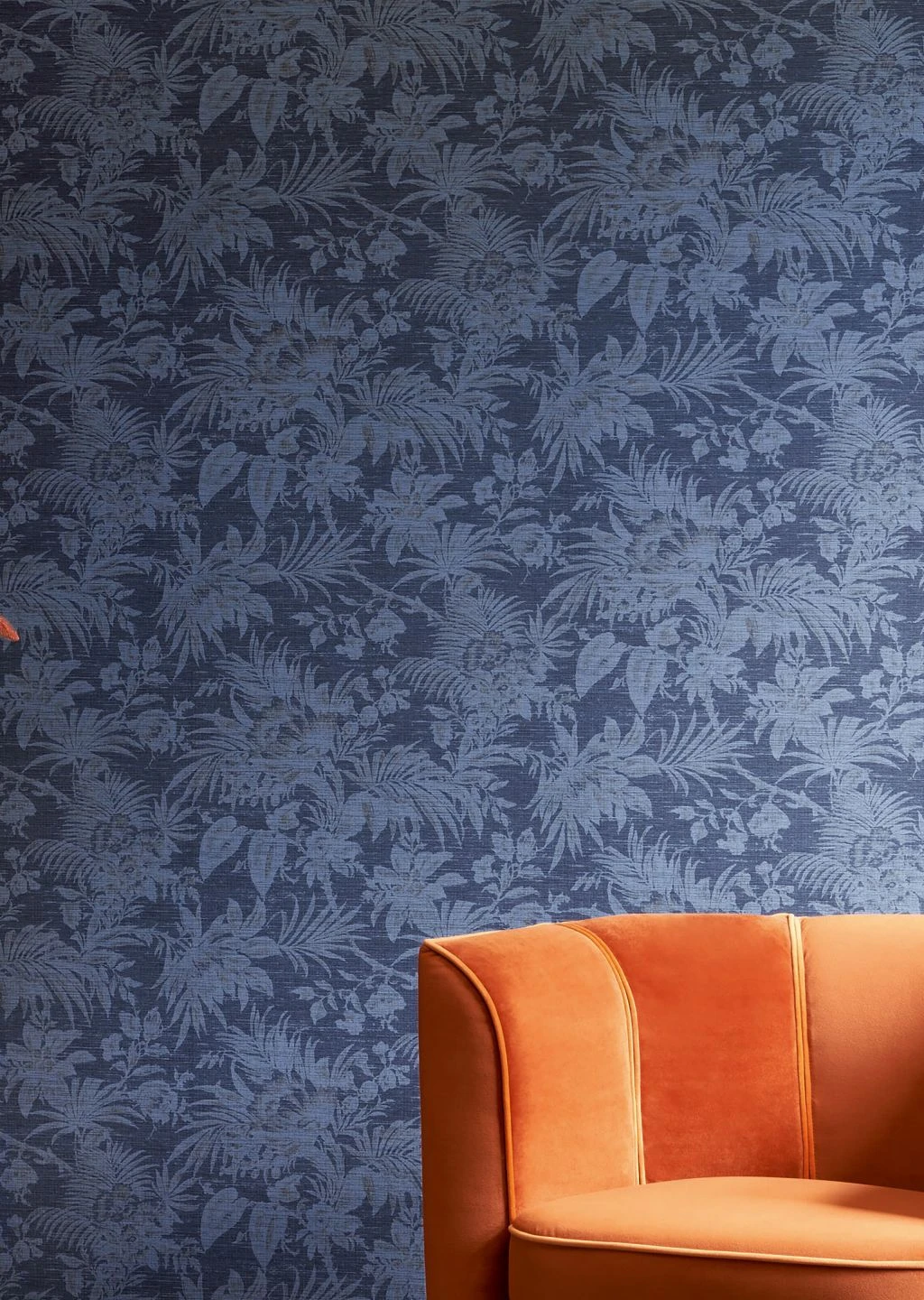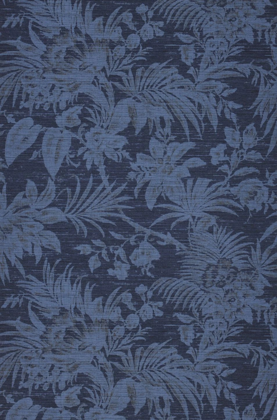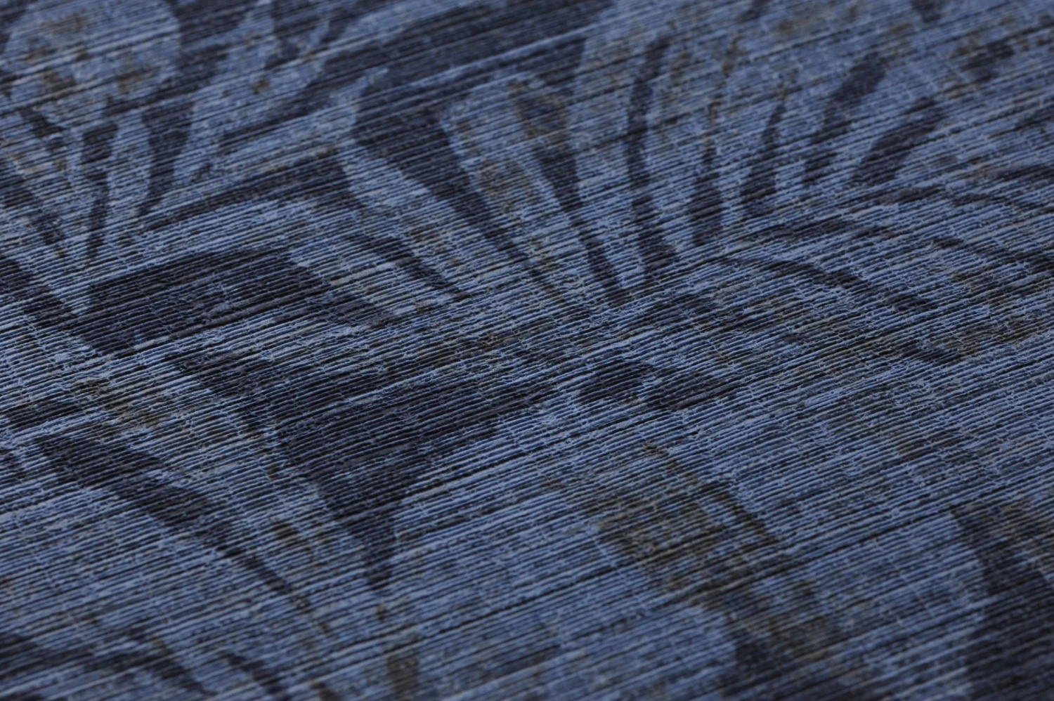 Nur schemenhaft sind die taubenblauen, leicht schattierten Blumen, Palmwedel, Blätter und Zweige auf dem graublauen Grund zu erkennen. Die feine, textilähnliche Struktur des Oberflächenmaterials lässt die Tapete wie das kostbare Gewebe eines Wandteppichs wirken. Das Vinyl der Oberfläche macht sie gleichzeitig scheuerbeständig. So können Sie selbst Ihr Badezimmer mit den besänftigenden Blautönen verschönern.