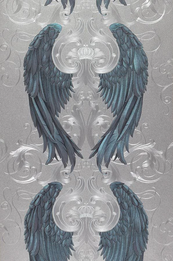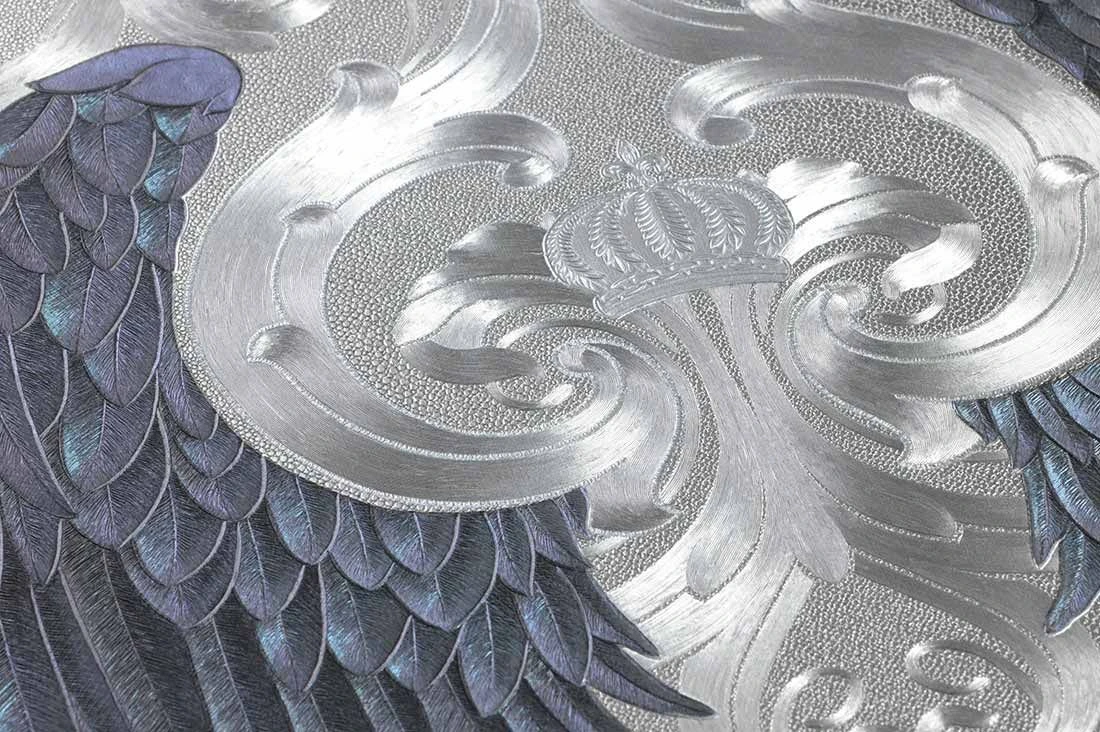 Glamourös und mysteriös zugleich wirken die Kronen und Engelsflügel der silbernen Tapete Morrigan. Die feine Prägung der Vinyl-Oberfläche erinnert an die Gravur eines luxuriösen Schmuckstücks.