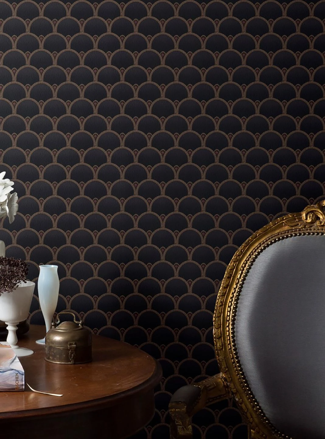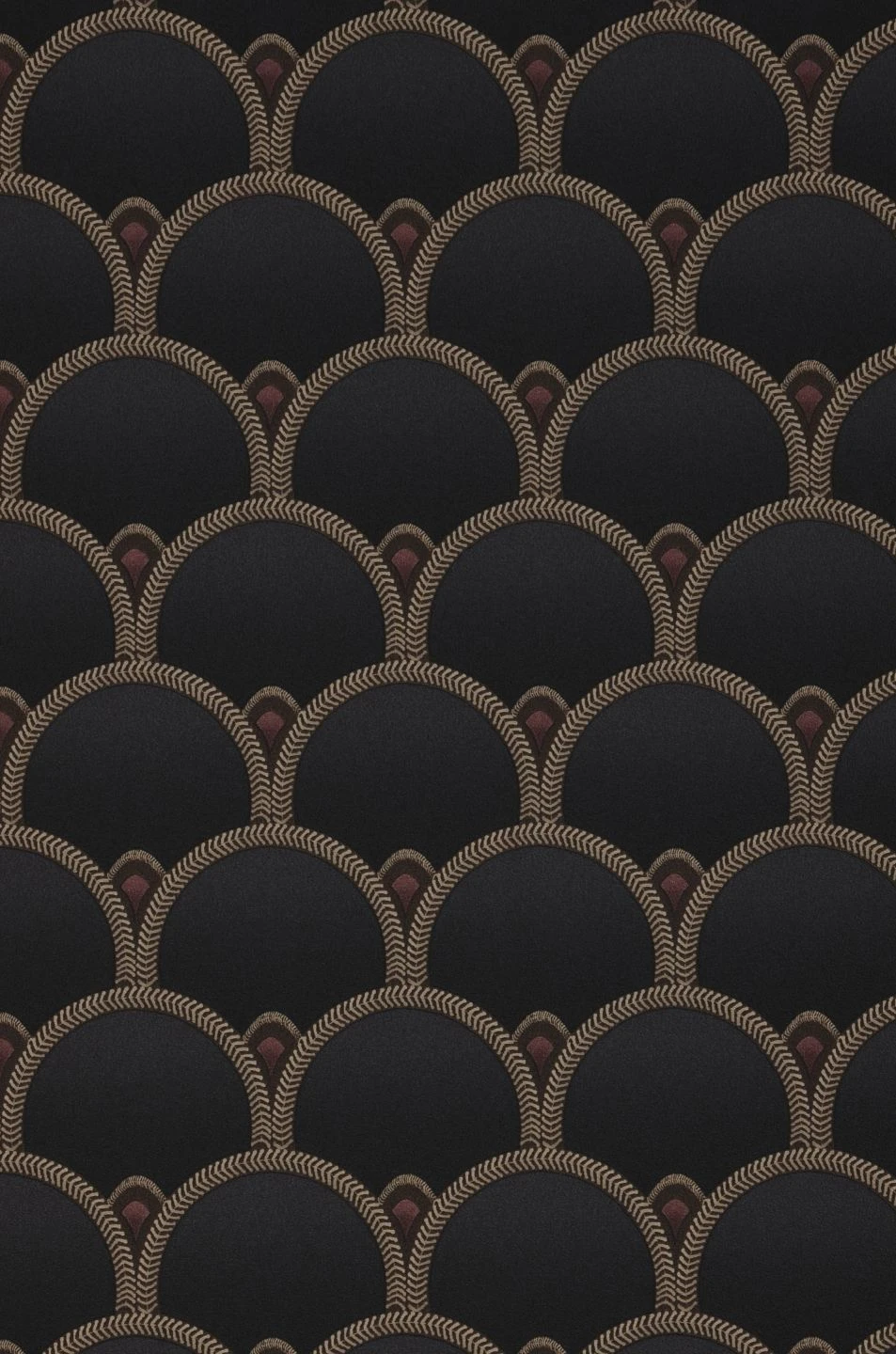 Schwarzgrau mit einem leichten Farbverlauf, abgesetzt mit Hellelfenbein, Graubraun und Rotviolett – die fächerförmigen Ornamente aus Bögen verbinden die Eleganz der Form mit der vornehm dunklen Farbgebung. Auch ein gutes Jahrhundert nach seiner Blütezeit versprechen die Gestaltungselemente des Art Deco zeitlosen Schick. Und warum nicht ein elegantes Badezimmer damit ausstatten? Die hoch waschbeständige Vinyloberfläche von Moxie ist dafür perfekt.