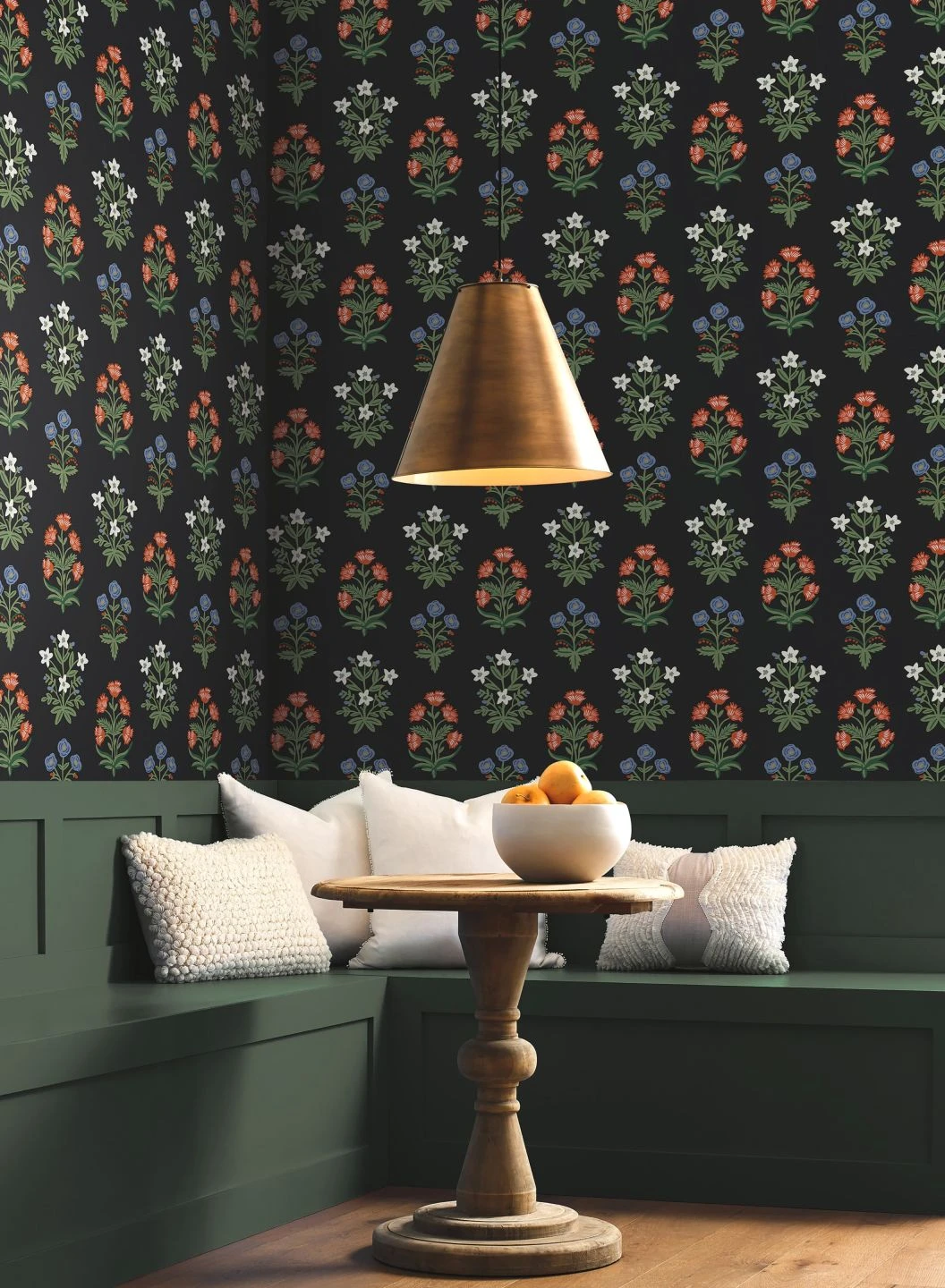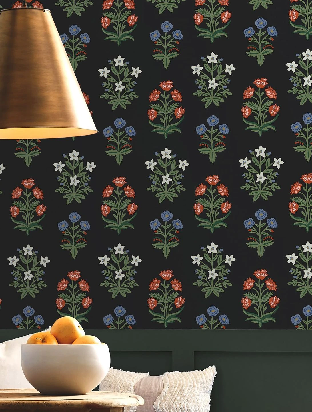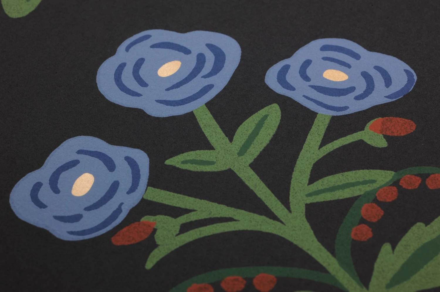 Blumentapete einmal anders: Die blühenden Pflanzen auf dem schwarzen Grund ziehen mit Sicherheit alle Blicke auf sich! Sie erinnern an eine aufwändige folkloristische Stickerei auf einem Samtstoff und kleiden Ihre Wände in ein festliches Gewand. Gerade der Kontrast zwischen dem dunklen Untergrund und dem Weiß, Rot und Blau der Blüten gibt der Vliestapete von Rifle Paper eine außergewöhnliche Ausstrahlung.