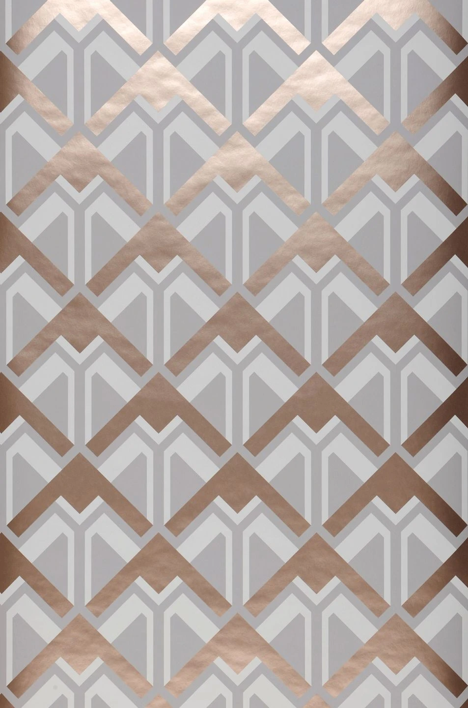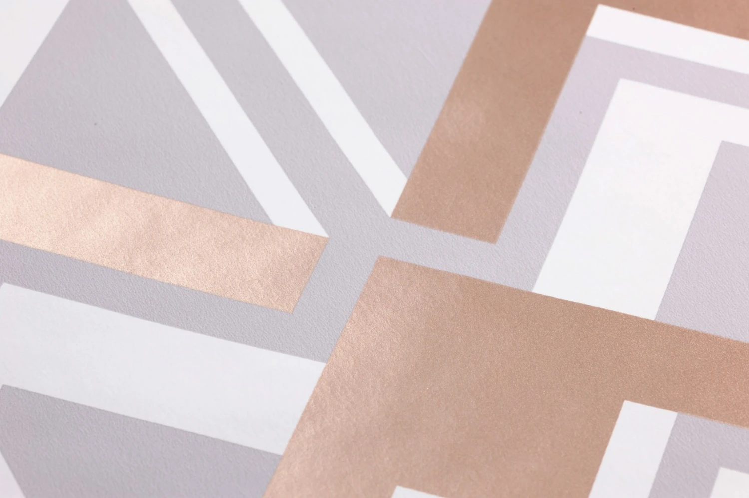 Kunstvolle Geometrie ohne Anspruch auf eine konkrete Zuordnung zeichnet diese grafische Tapete aus. Während die Elemente in Grau und Weiß dem aufstrebenden Gedanken folgen, vermittelt Rosenholz Schimmer die Vision von plastischer Tiefe. Das moderne Art Deco Muster harmoniert wunderbar mit authentischen Vintage Looks.