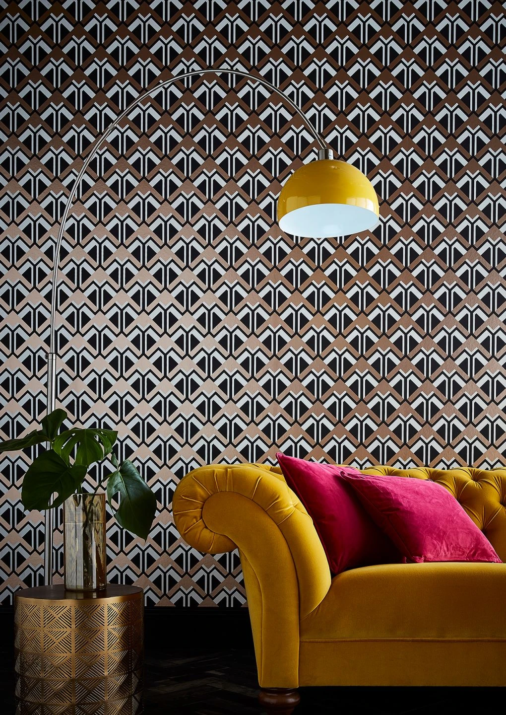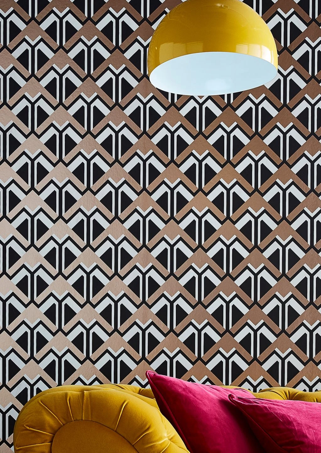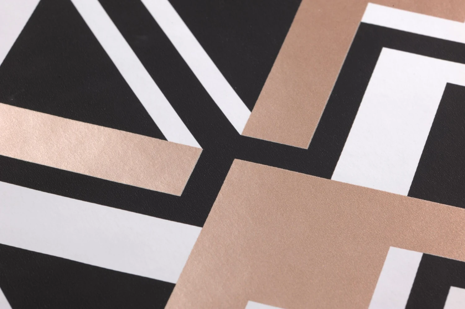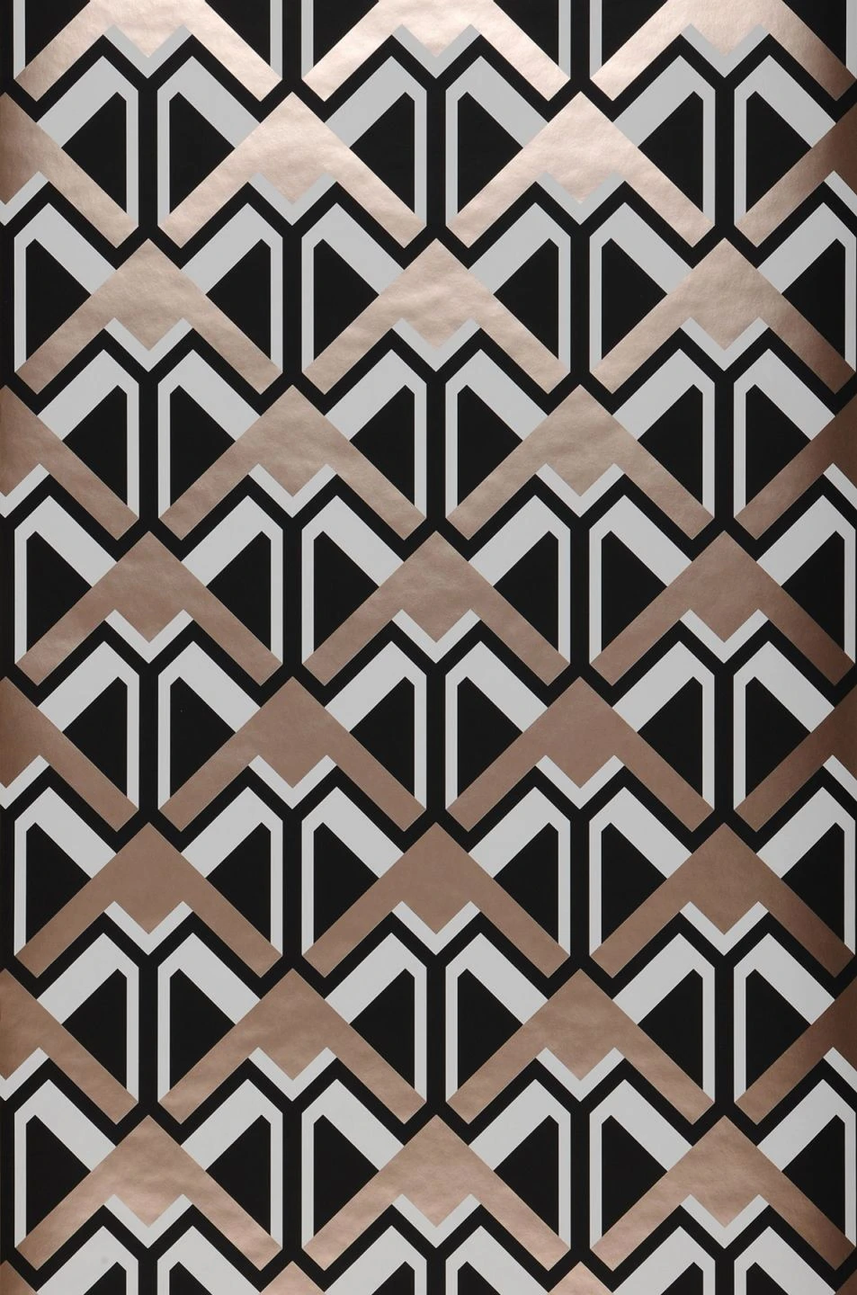 Siebziger Jahre Design im neuzeitlichen Update – Tapete Nerea holt alles aus der Effekttrickkiste heraus, um das Auge in seinen Bann zu ziehen. Wie Pfeile muten die graphischen Elemente an, die konstant aufwärts zeigen. Rose Gold Glanz sorgt dafür, dass Schwarz eine neue Ebene eröffnet, die das Muster dreidimensional erscheinen lässt.