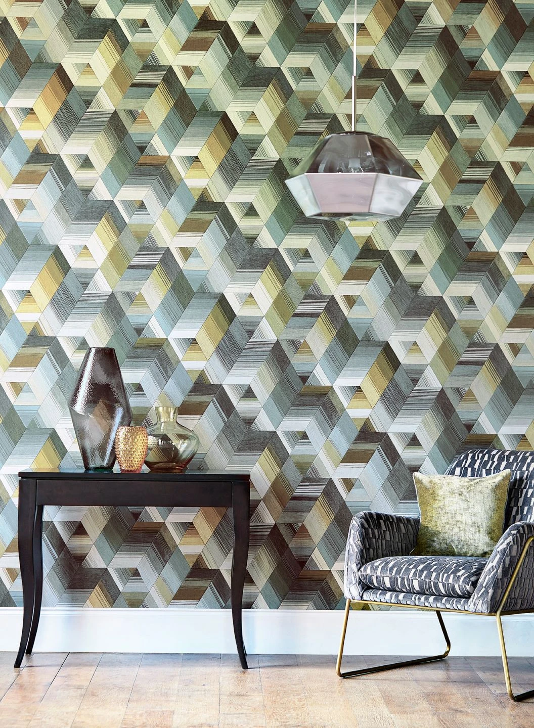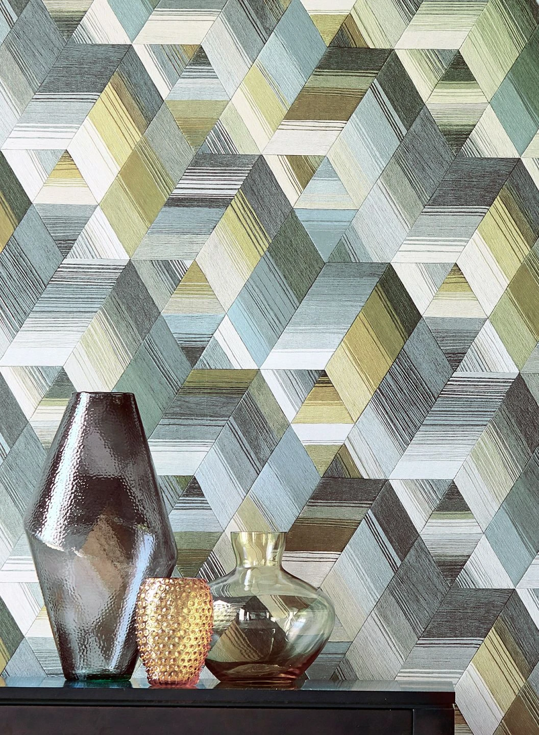 Wie in einer der berühmten Zeichnungen von M. C. Escher wird Ihre Wand mit dieser Tapete zu einer optischen Illusion dreidimensionaler Tiefe. Die raffinierte Anordnung der farbigen Streifen und Linien zu Dreiecken und Trapezen lässt räumliche Gebilde entstehen. Harmonisch ergänzen sich die Beige-, Grau- und Khakitöne. Die ausdrucksvolle Tapete verträgt charakterstarke Möbel in den passenden Farben.