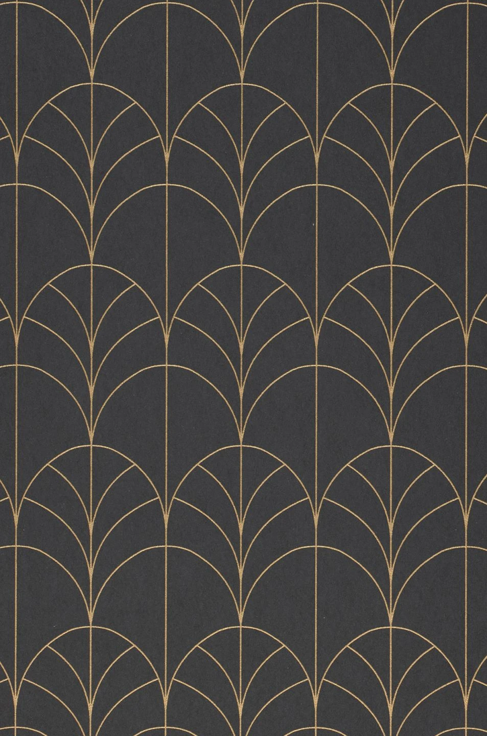 In dunklen Farben gestaltete Räume vermitteln behagliche Eleganz und zeigen mitunter auch sehr exotische Nuancen. Glamouröse Exotik ist das Stichwort für diese Designtapete im Art Deco Stil, die sich nach Lust und Laune frei entfalten kann. Schokoladiges Schiefergrau setzt das schimmernde Gelbgold des Musters perfekt in Szene.