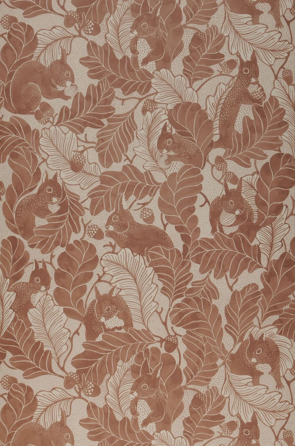 Perfekt getarnt sind die niedlichen Eichhörnchen zwischen üppigen stilisierten Eichenblättern. Denn ihre buschigen Schwänze sind von den geschwungenen Blättern nur zu unterscheiden, wenn man genau hinsieht! Das Spiel mit der Tarnung ist in einem sanften, warmen Blassrotbraun gehalten, das zum cremeweißen Grund wunderbar passt. Eine warmherzige Tapete, die einen Hauch von Vintage mitbringt und sich in jedem Zimmer gut macht.