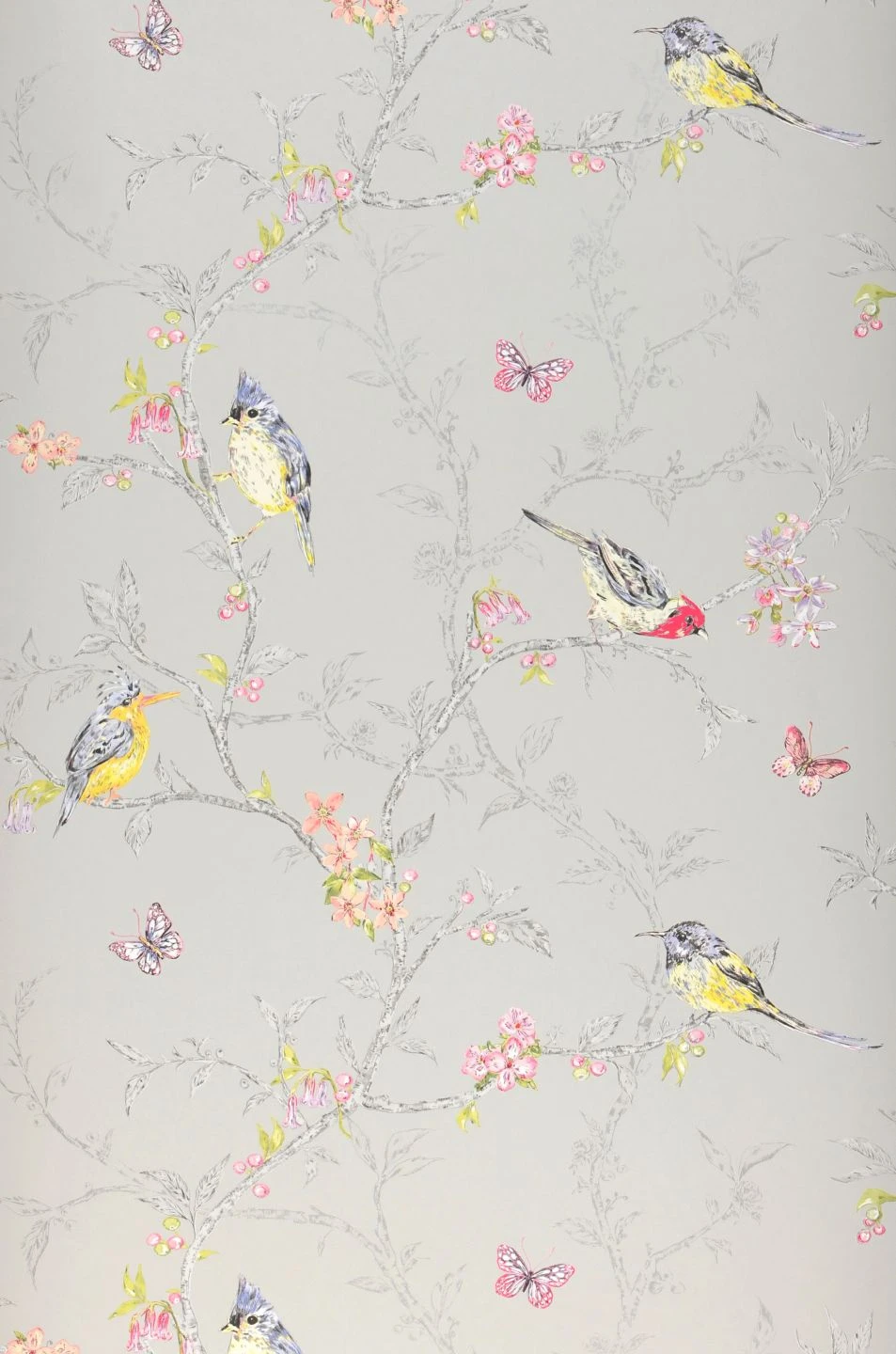 Die geschickte Farbgebung der Tiermotiv-Tapete Onni lenkt den Blick auf die farbenfrohen, zierlichen Vögel, die Schmetterlinge und Blüten in Rosatönen. Denn die Zweige, auf denen die Vögel sich tummeln, sind in verschiedenen Grautönen dargestellt. So entsteht der Eindruck räumlicher Tiefe, während das bunte Leben im Vordergrund verortet ist. Besonders schön wiedergegeben ist die flauschige Struktur des Gefieders der Singvögel, die man fast zu hören meint.