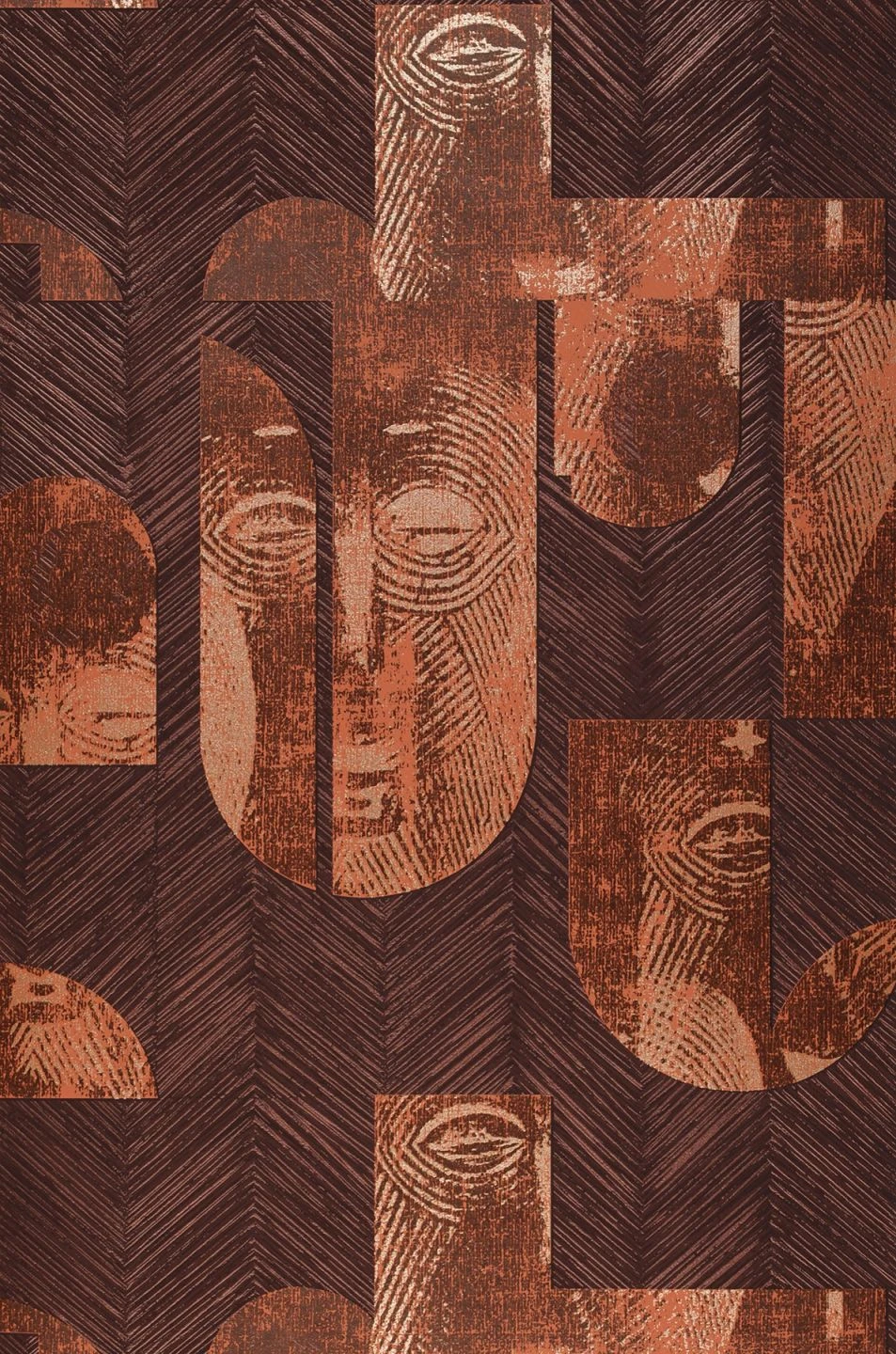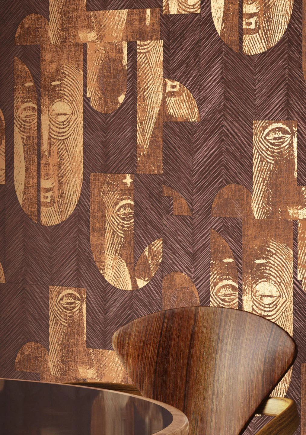Als Vorbilder für die graphischen, fein schimmernden Musterelemente dienen fantasievolle afrikanische Holzmasken. Warme Holztöne wie Mahagonibraun, Nussbraun und Rosenholz fangen den ursprünglichen Charakter ein. Die extravagante Designtapete setzt ein Understatement für die afrikanische Lebenskultur, die ihren eigenen Wohnstil hervorgebracht hat.