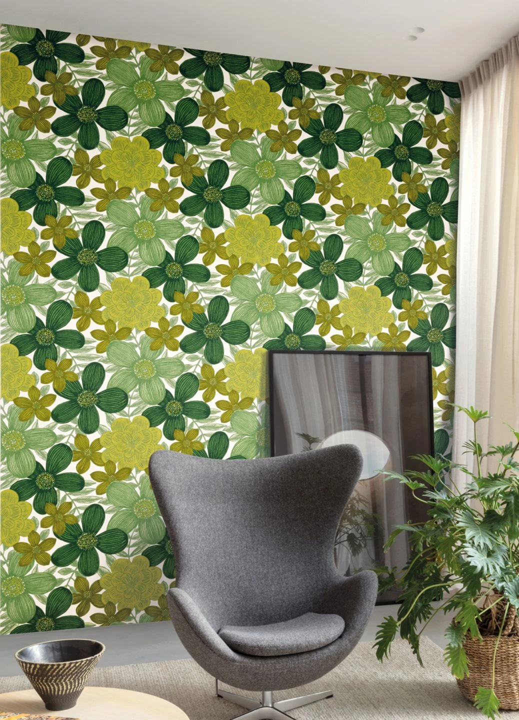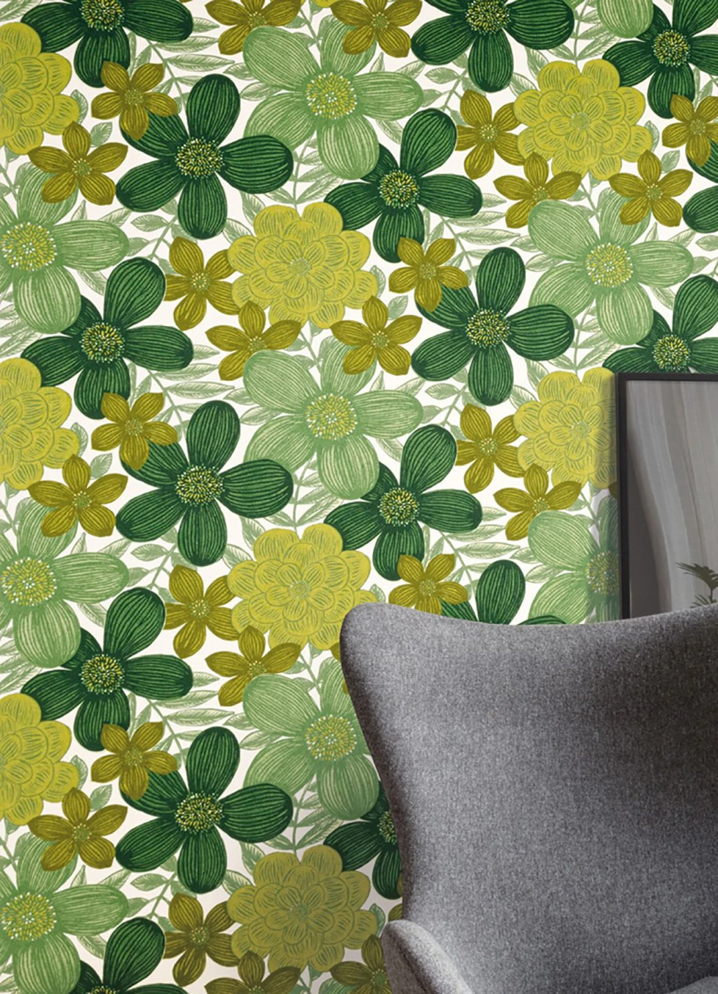 Große stilisierte Blumen mit leicht schraffierten Blütenblättern in leuchtenden Nuancen von Grün bringen Leben und angenehmes Licht ins Zimmer, ähnlich wie das Sonnenlicht unter dem jungen Blätterdach eines Laubwalds im Frühling. Die Frische der Grüntöne strahlt positive Energie aus und verbreitet gute Laune. Kombiniert mit Weiß oder hellem Holz entfaltet die Vliestapete große Strahlkraft. Doch auch gedeckte Farben ergänzen sie prächtig.