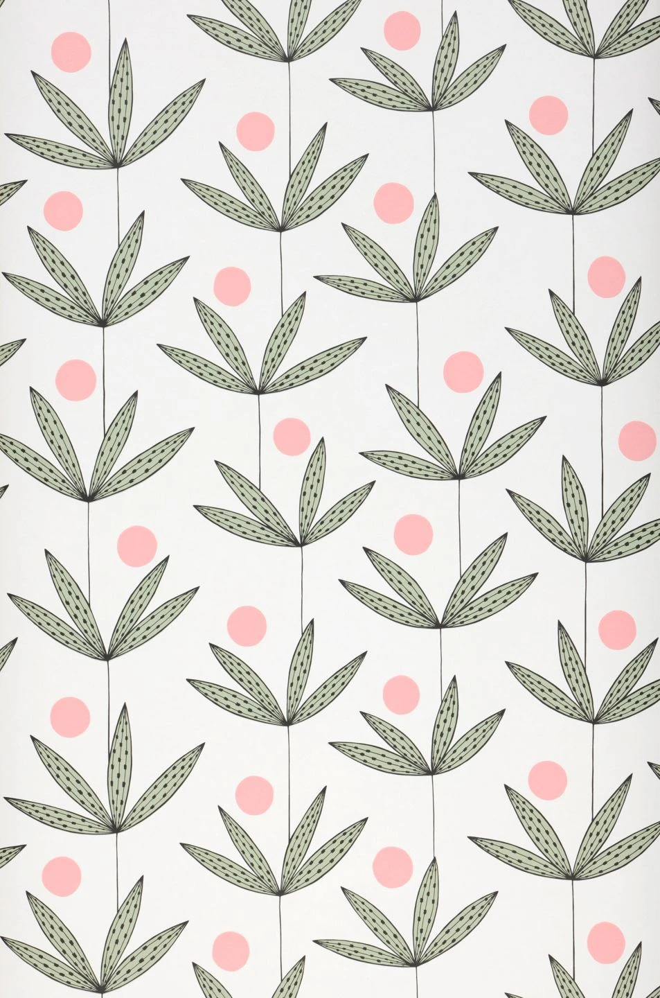 Zierliche stilisierte Palmenblätter in einem hellen Blassgrün scheinen an ihren Stielen zu tanzen. Aufgelockert wird das minimalistische Design durch die rosafarbenen Punkte, die sich mit den Blättern abwechseln und die weiße Fläche mit Leben erfüllen. Ein Hauch von Nostalgie umweht die Vliestapete, die sich ebenso schön für Vintage-Einrichtungen wie für eine Ausstattung im skandinavischen Stil eignet.