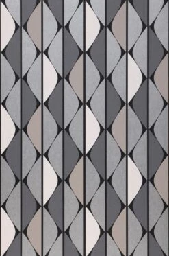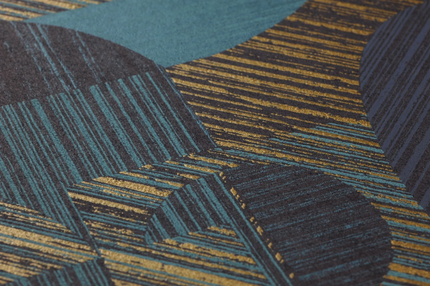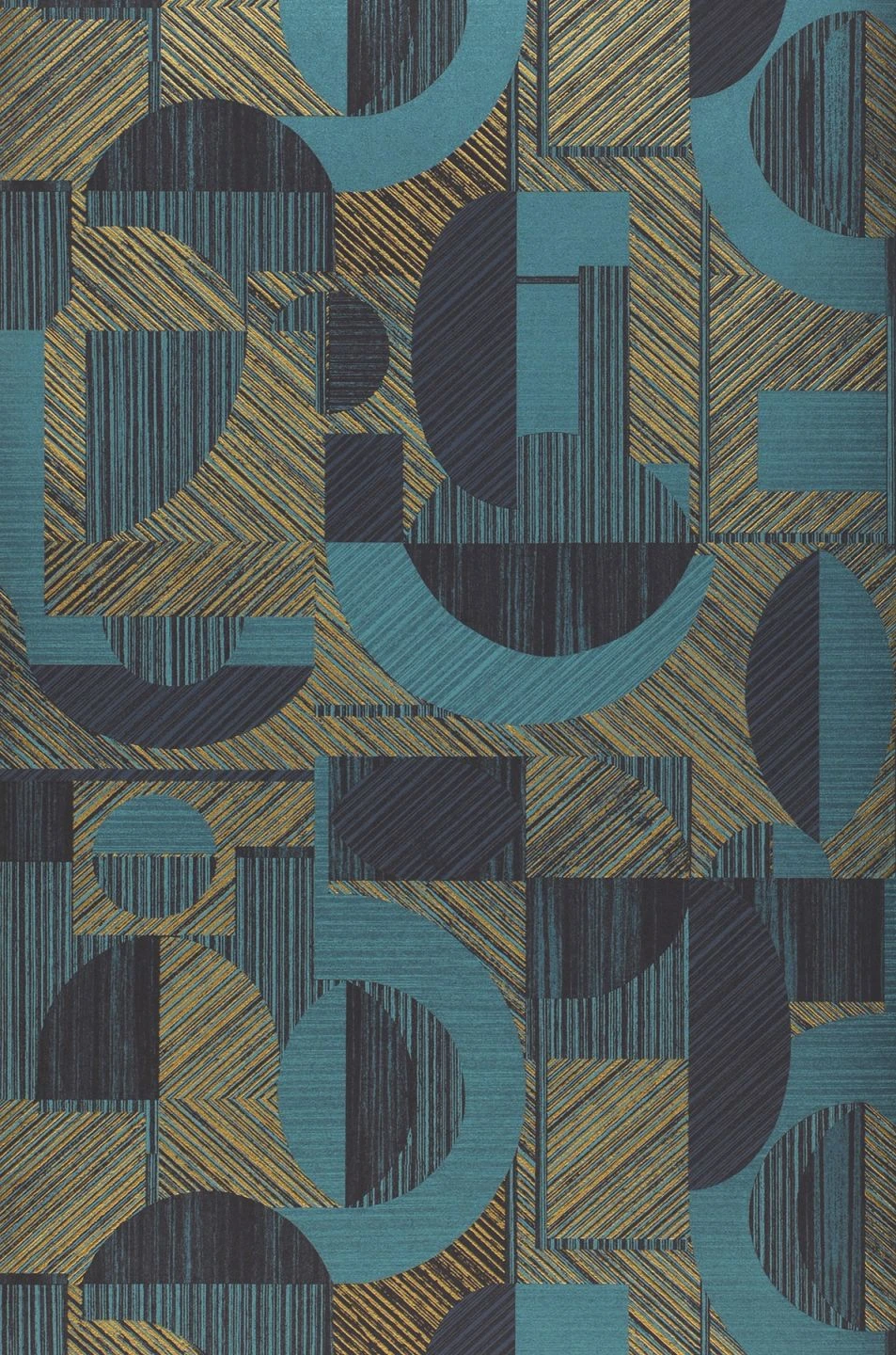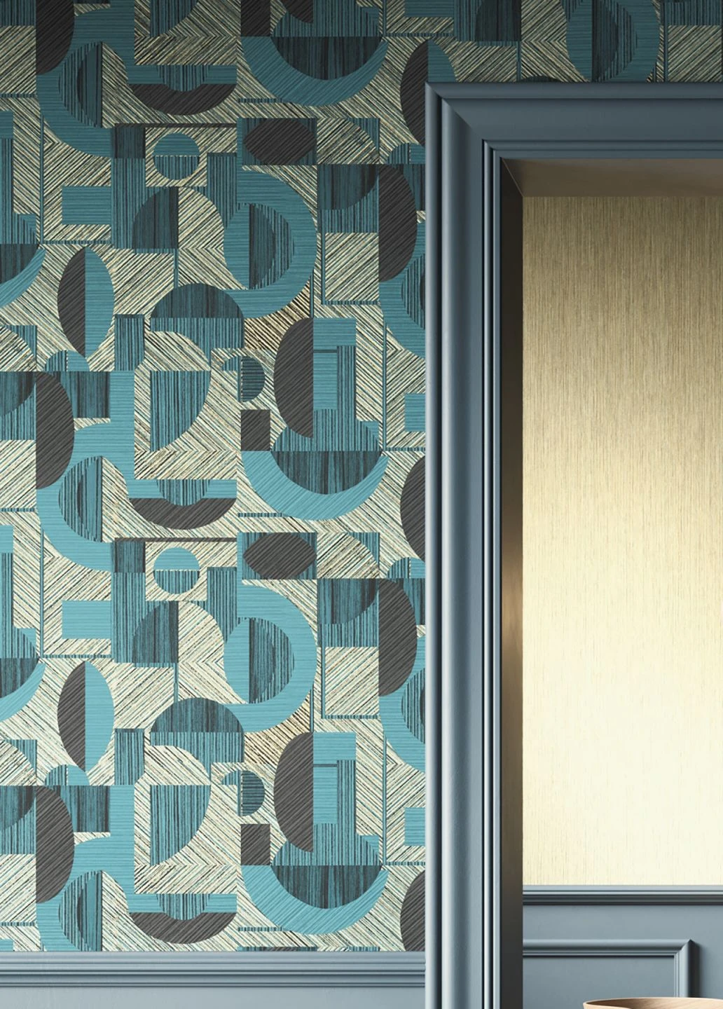 Aus Schraffuren in perfekt abgestimmten Farbtönen werden abstrakte graphische Formen. Zwischen Grünblau und Schwarz sind der Clou schraffierte Linien in schimmerndem Türkisblau und Gelbgold, die für reizvolle Highlights sorgen und das einfallende Licht reflektieren. Die Formenvielfalt aus Halbkreisen, Bögen und Rechtecken ist ein lebendiger Hintergrund für charaktervolle Einrichtungselemente.