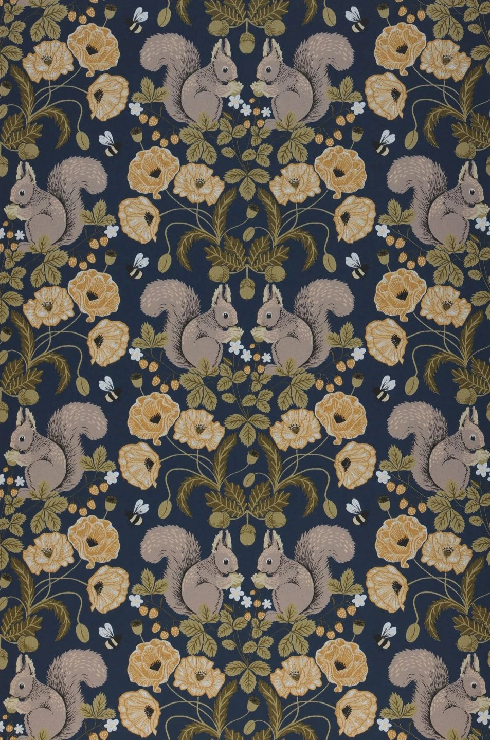 Hier sind die niedlichen Eichhörnchen der Hingucker. Immer zu zweit angeordnet, setzen sie sich zusammen mit den Blüten, Blättern und Früchten, die sie umgeben, zu einem symmetrischen, klassisch anmutenden Arrangement zusammen. So vereint Pihla Vintage-Elemente in Farbgebung und Form mit ausgefallenen Motiven, die zum freundlichen skandinavischen Stil ebenso harmonieren wie zu antiken Möbeln. Der dunkelblaue Hintergrund steuert Ruhe und Hochwertigkeit bei.