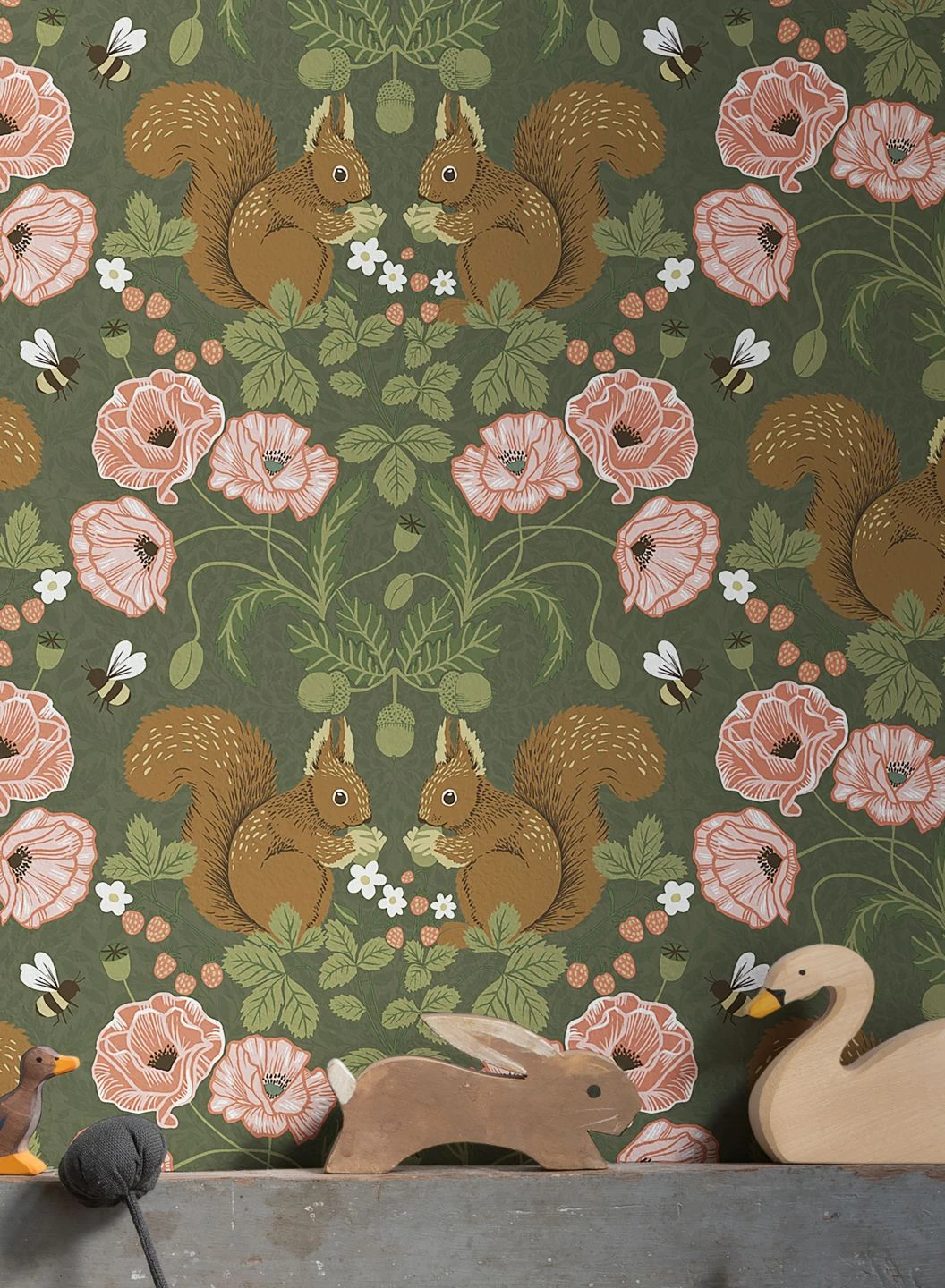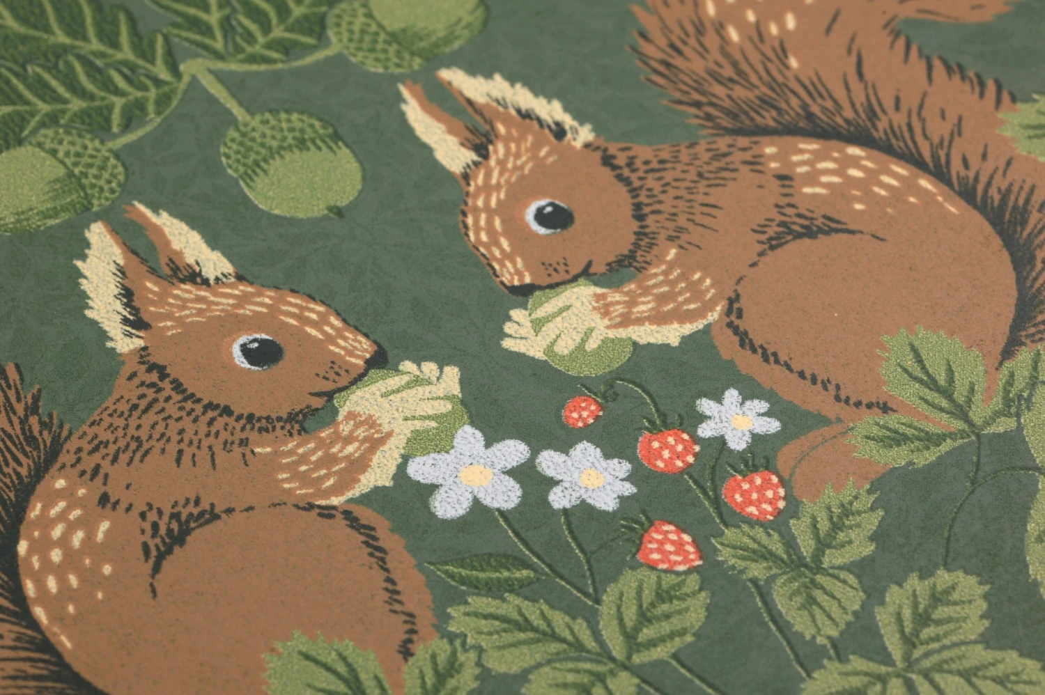 Fast naturgetreu anmutende Eichhörnchen, umgeben von üppigen Blüten, Blättern und reifen Früchten, beleben Ihren Raum mit ihrem Charme. Die Vliestapete Pihla vereint raffiniert Tradition und Moderne. Der kieferngrüne Grund, die hellgrünen stilisierten Blätter und Blüten in Hellrosa und Korallenrot erinnern an englische Tapeten im Stil von William Morris. Doch durch die Eichhörnchen und Bienen strahlt Pihla zeitlose Lebendigkeit aus. Von Vintage über Shabby Chic bis zum skandinavischen Stil sind den Einsatzmöglichkeiten keine Grenzen gesetzt.