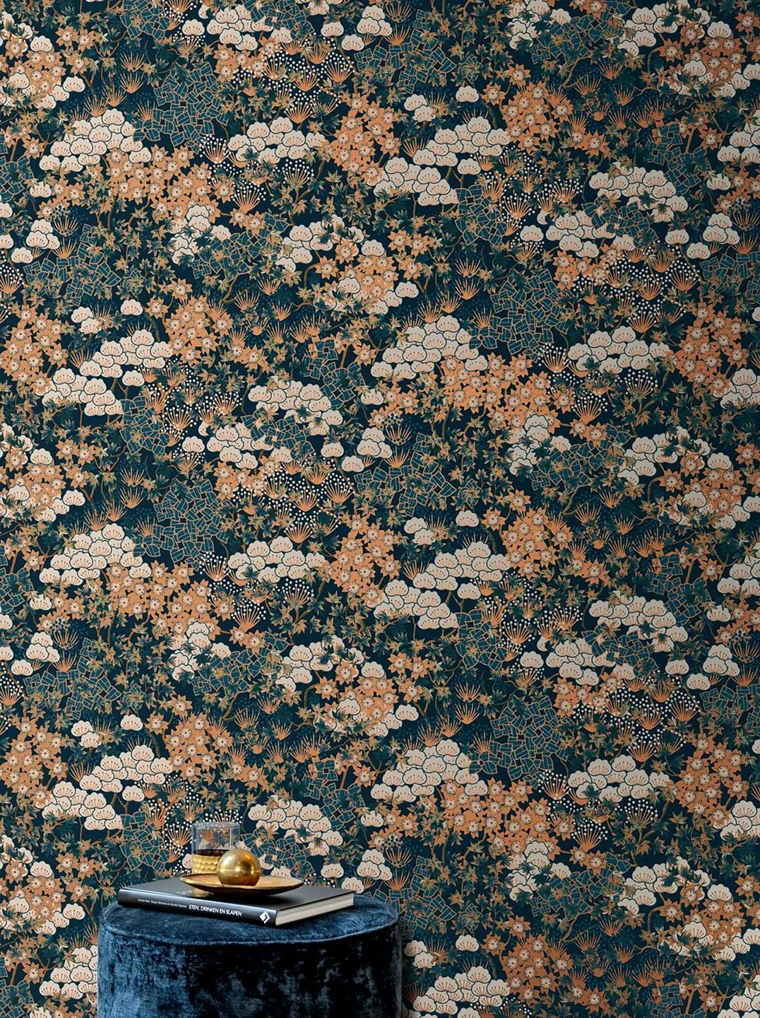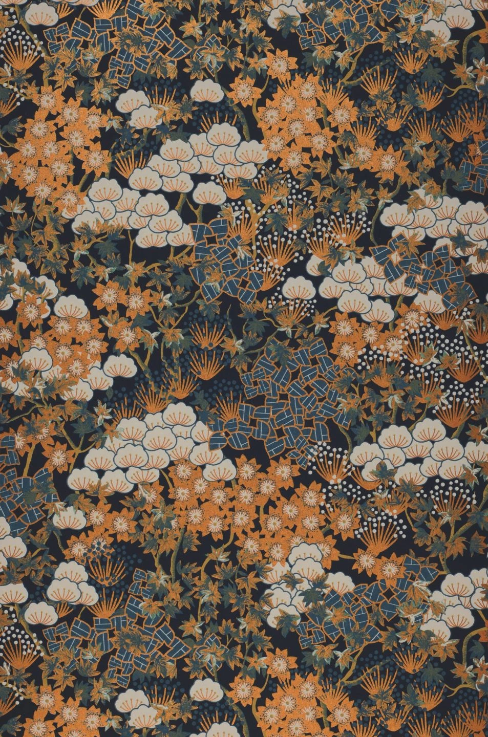 Prachtvoll blühende Bäume in Beige und Cremeweiß, Grün, Grünblau und schimmerndem Orangebraun machen Pondichery zu einem wahren Blütenmeer. Die orientalisch anmutende Darstellung der stilisierten Bäume kommt durch die Farbzusammenstellung, die an exotische Gewürze erinnert, besonders zur Geltung. Auf dem dunklen, matt schwarzblauen Grund entwickeln die kräftigen Farben ihre ganz eigene Leuchtkraft.