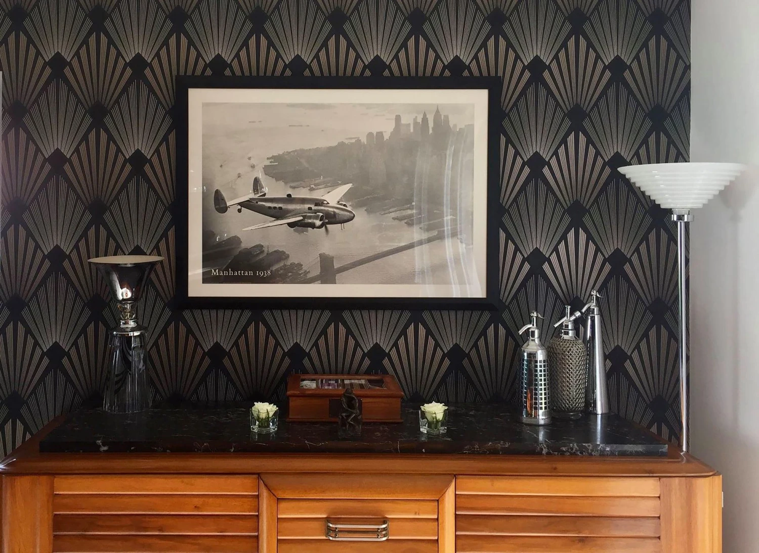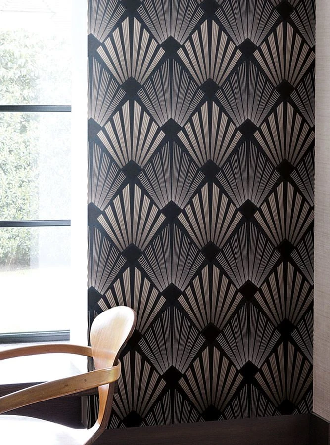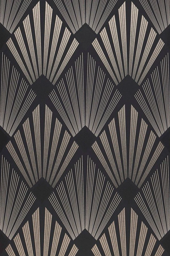 Exzentrische Farben und das effektvolle Art Deco Muster verleihen dieser Variante des Tapetenmodells Pontinius eine geheimnisvolle Aura. Anthrazit, Schwarz, Perlbeige und Seidengrau wirken in ihrer Kombination irisierend und entspannend. Die fächerartige Musterkunst verleiht dem Raum leidenschaftliche Tiefe.