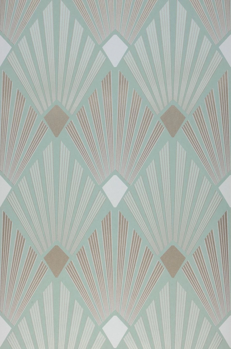 Aus dem ausgeklügelten Zusammenspiel von Farbe und Form entsteht ein Design ganz im Stil des Art Deco. Sich verbreiternde Streifen gehen wie Strahlen von rautenförmigen Zentren aus und setzen sich zu einem klaren, geradlinigen Muster aus großen Fächern zusammen, das eine mitreißende Dynamik entwickelt. Graubeige und Pastelltürkis unterstreichen den unwiderstehlichen nostalgischen Charme der Tapete.