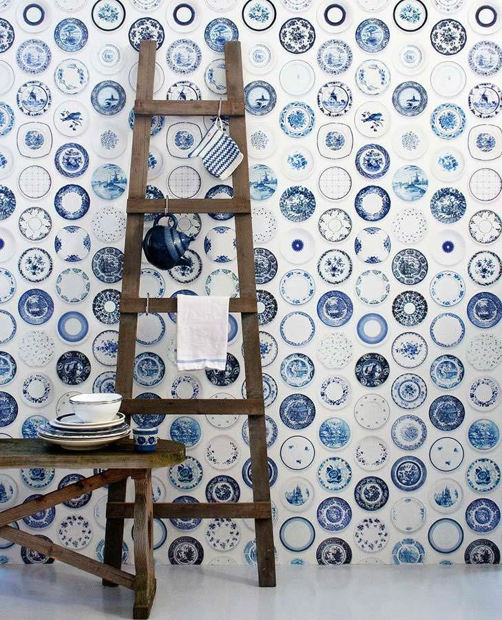 Eine Sammlung feinster Porzellanteller in Blau und Grauweiß schmückt die Wand wie in einem Herrenhaus. Detailgenau werden die zartesten Linien dargestellt und wie oft man auch die Tapete betrachtet, man findet immer wieder etwas neues.