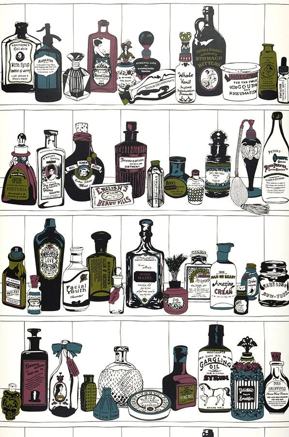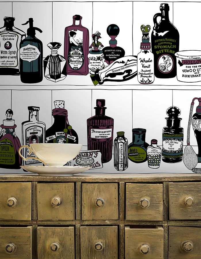 Die kuriose Flaschensammlung mit verspieltem Touch zaubert ein nostalgisches Lebensgefühl in Schlafzimmer oder Bad. Umgeben Sie sich mit pompösen Flakons und jeder Menge Fläschchen für die Schönheit. Die stilvolle Dupenny Design Tapete ist mit einer waschbeständigen Oberfläche ausgestattet und daher auch für den Feuchtraum geeignet.