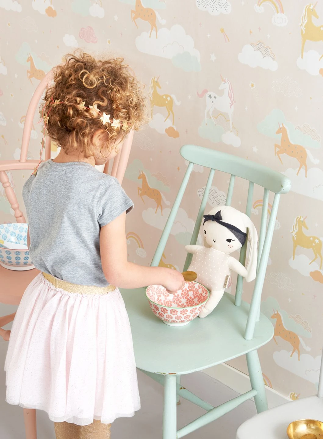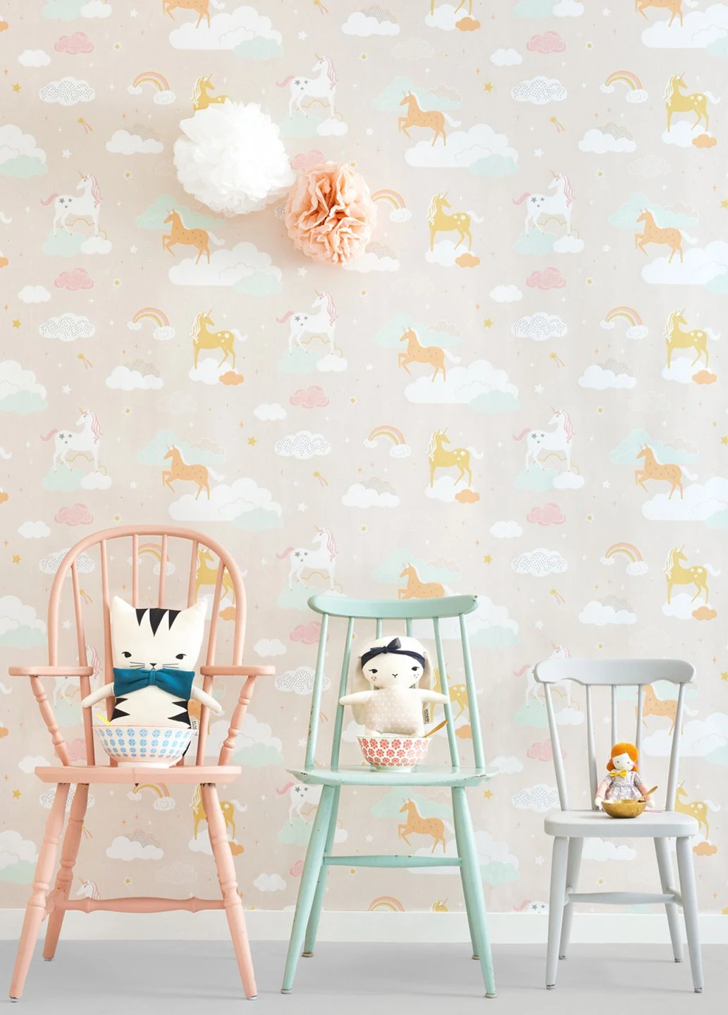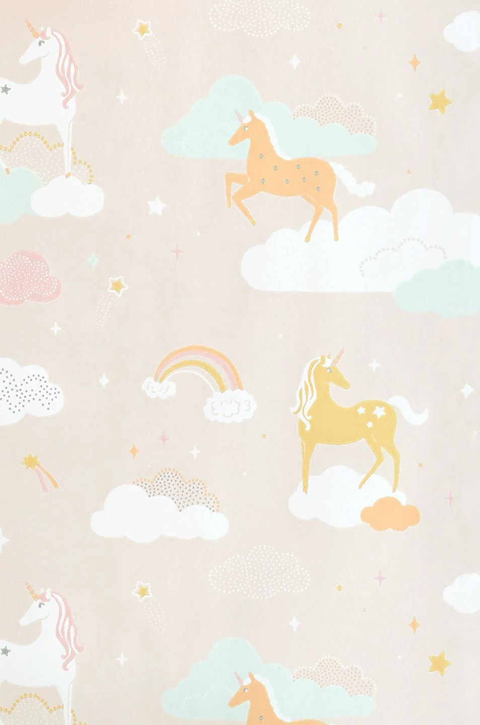 Bunte Einhörner auf Wolken, dazwischen Sterne und Regenbögen – die Vliestapete „Rainbow treasures“ vom schwedischen Hersteller Majvillan beschwört ein kindliches Abenteuerland herauf. Die Motive in Altrosa, Cremeweiß, Honiggelb, Pastellorange und Weißgrün und der zartrosa Hintergrund wirken freundlich und anregend. Die hochwertige, im Leimdruckverfahren bedruckte Tapete begleitet Ihr Kind behutsam auf seiner Entdeckungsreise in die Welt.