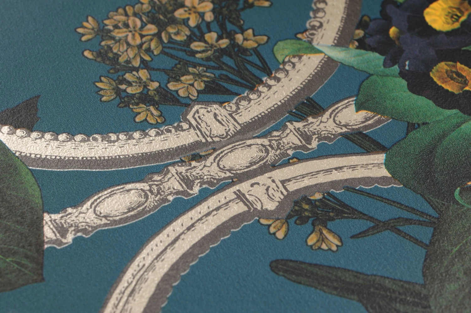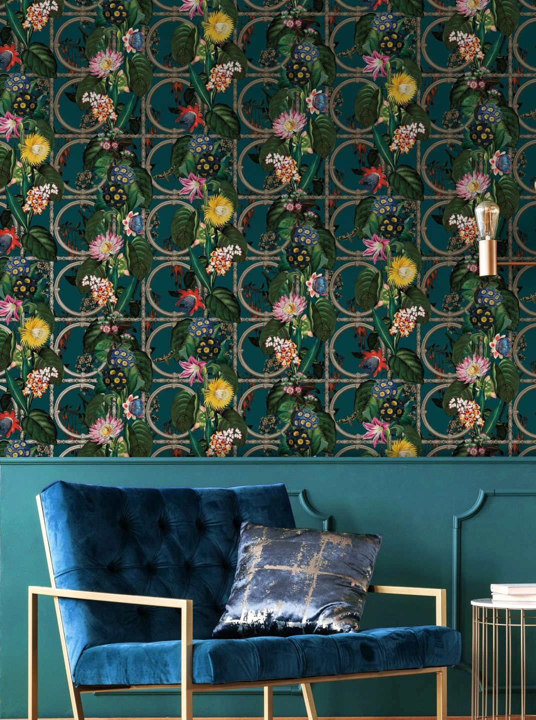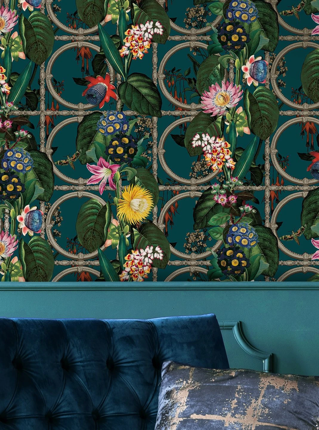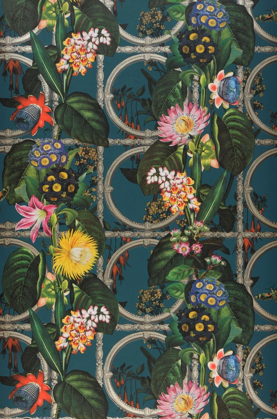 Tropische Pflanzen mit schön gemusterten Blättern und exotisch geformten, leuchtend bunten Blüten ranken sich durch die Stäbe und Ringe eines metallenen Spaliers. Der tief ozeanblaue Hintergrund, der zwischen den detailgetreu gezeichneten Blüten und Blättern hindurchleuchtet, wirkt wie der Himmel kurz nach Sonnenuntergang und versetzt Ihren Raum in die ruhige Stimmung eines Abends in einer warmen südlichen Region – perfekt für einen erholsamen Feierabend!