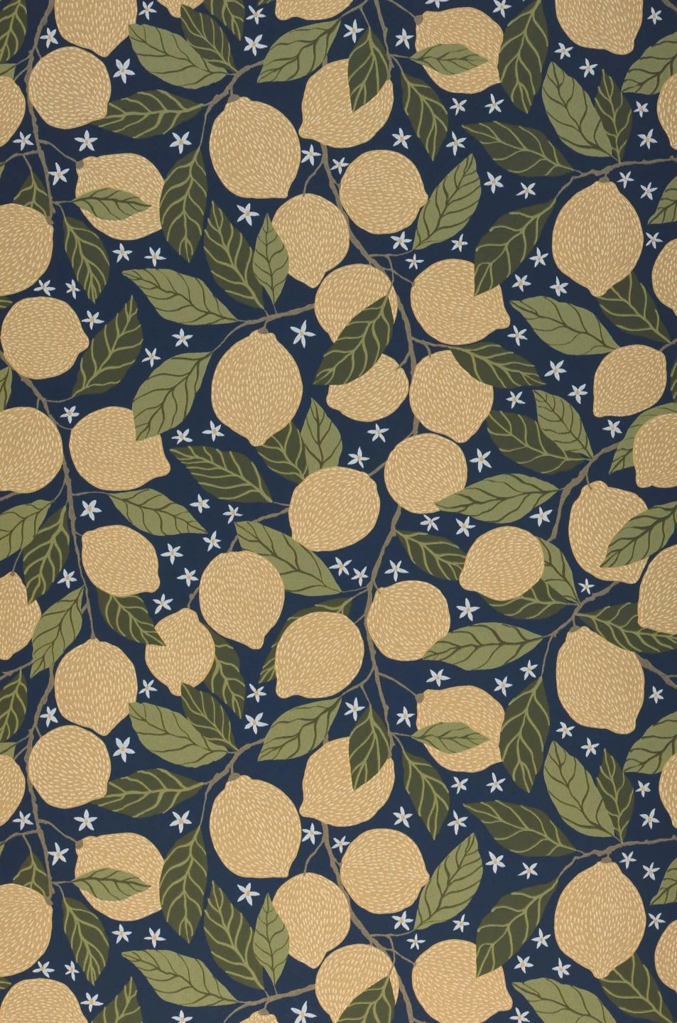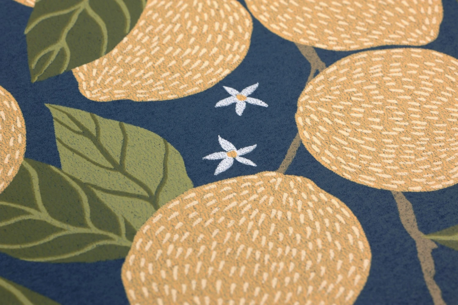 Das Land, wo die Zitronen blühen, beschwört die botanische Tapete Raphael herauf. Reife Früchte mit filigraner Zeichnung, die an die porige Oberfläche einer Zitrusfrucht erinnert, wachsen an schlängelnden Ranken mit kräftigen Blättern und zarten sternförmigen Blüten. Der dunkelblaue Untergrund der Vliestapete, von dem sich die Musterfarben voller Leuchtkraft abheben, erinnert an die magische Atmosphäre eines Abends im Süden.