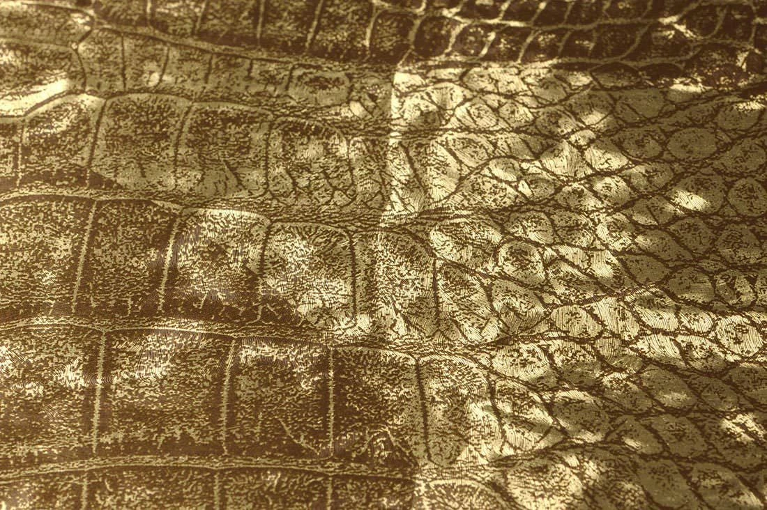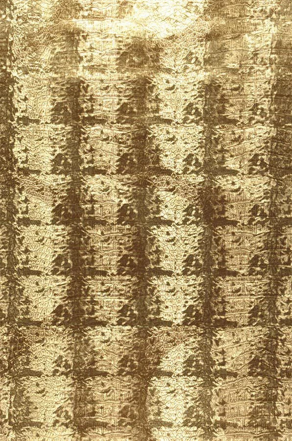 Exklusive Lederoptik für die Wände – luxuriös golden schimmernd und in welligen Formen arrangiert. Die handbedruckte Vliestapete von Flavor Paper spielt mit dem Look von echtem Krokodilleder und kreiert eine vornehm-elegante und dabei unaufdringliche Ästhetik für Flur oder Lobby, Schlaf- oder Wohnräume. Sie erhalten die Tapete ab einer Mindestabnahmemenge von drei Rollen.