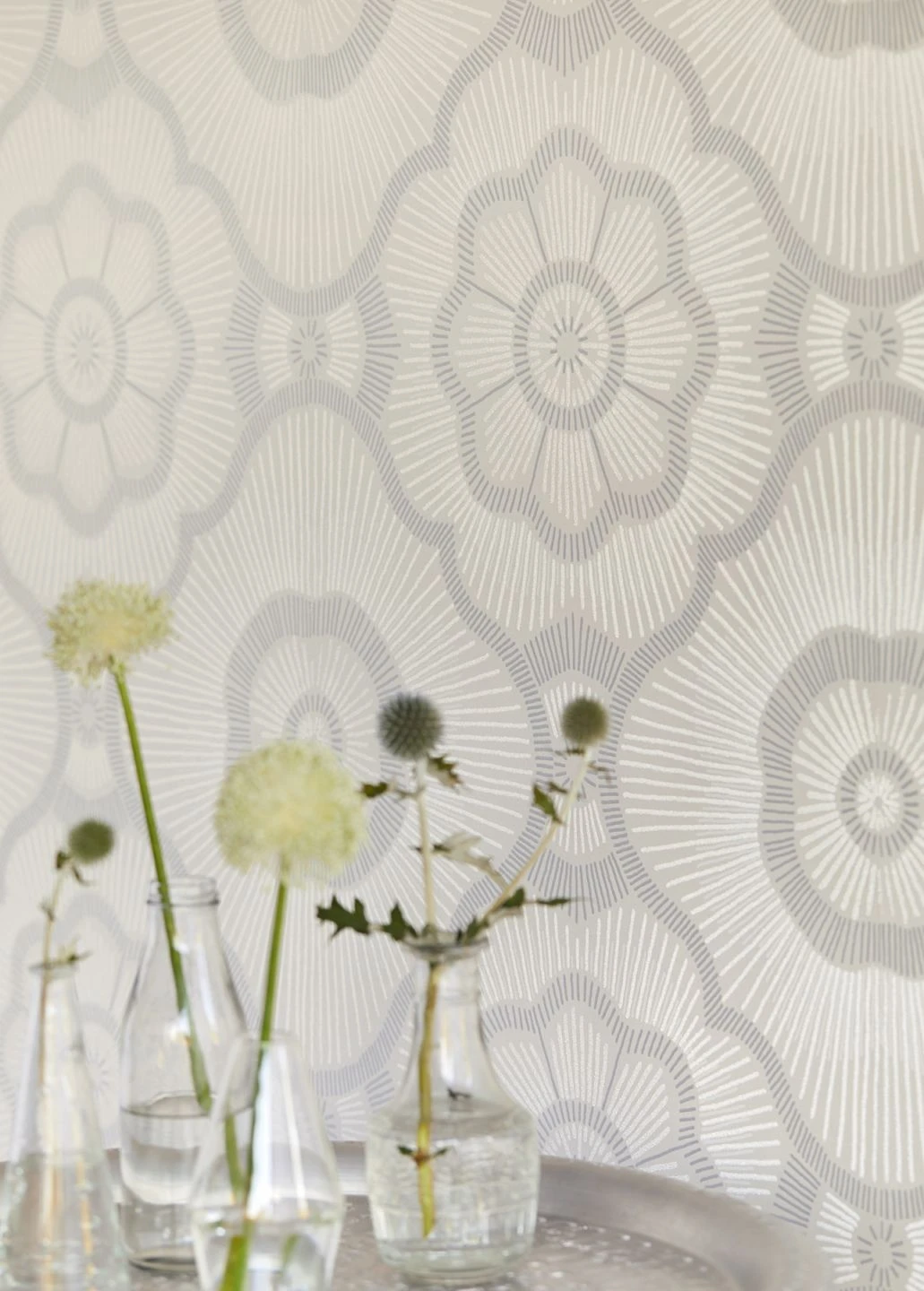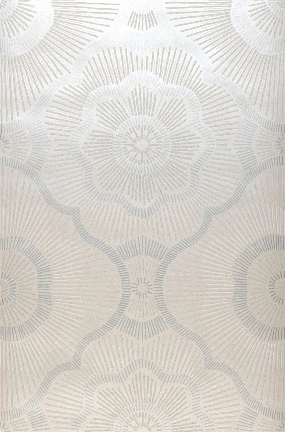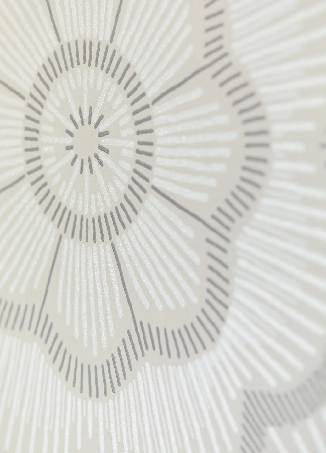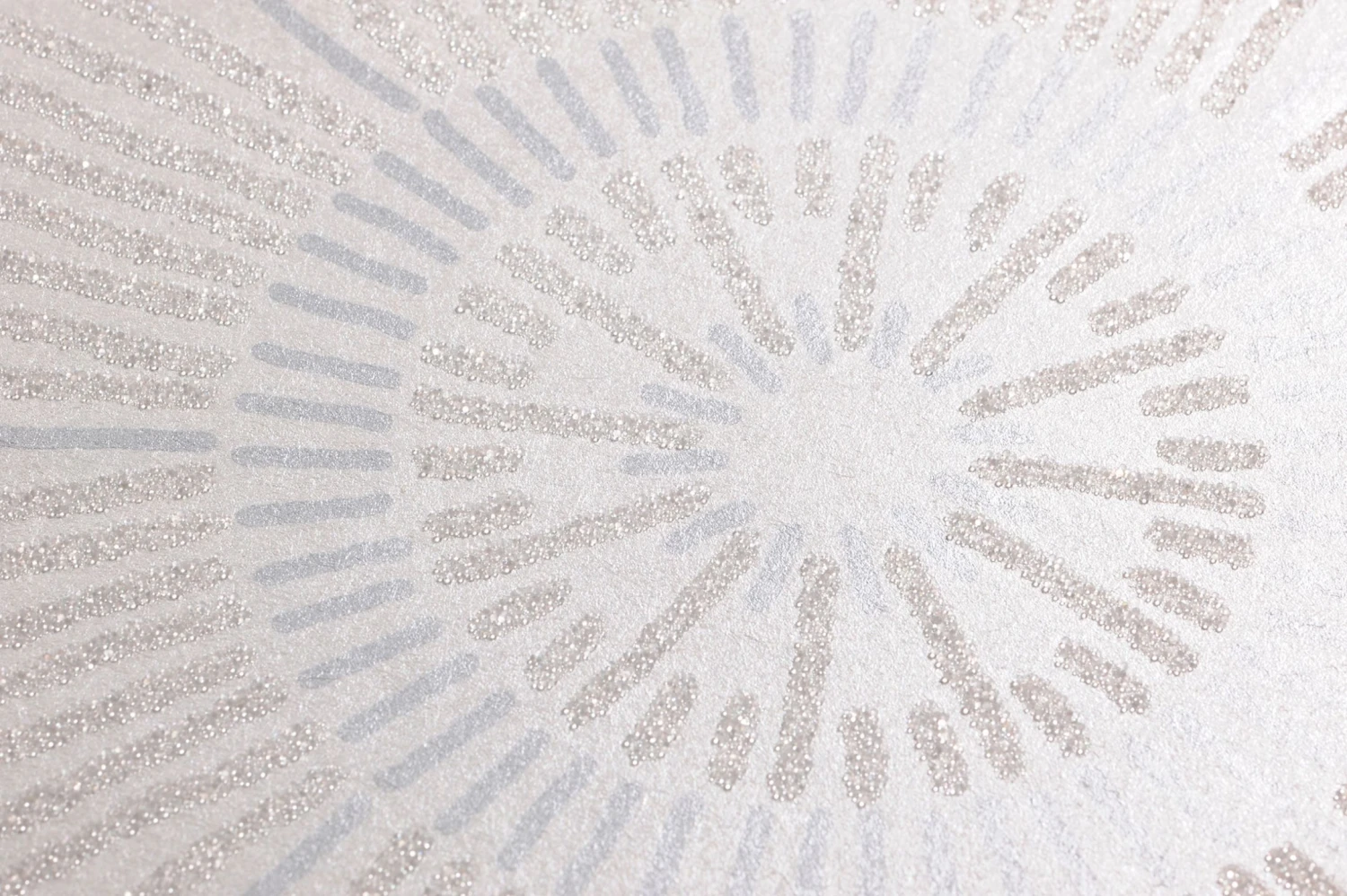 Kleine Glasperlen bilden ein fühlbares Relief und unterstützen mit ihrem Glitzern die anziehende Wirkung der Linien in Cremeweiß, Perlhellgrau und Weiß, die auf dem leicht schimmernden cremeweißen Grund ein ausladendes Muster aus stilisierten Blüten entstehen lassen. Durch die strahlenförmige Anordnung der Linien lenkt die Tapete alle Blicke auf sich und verleiht Ihrem Raum eine unverkennbare Eleganz.