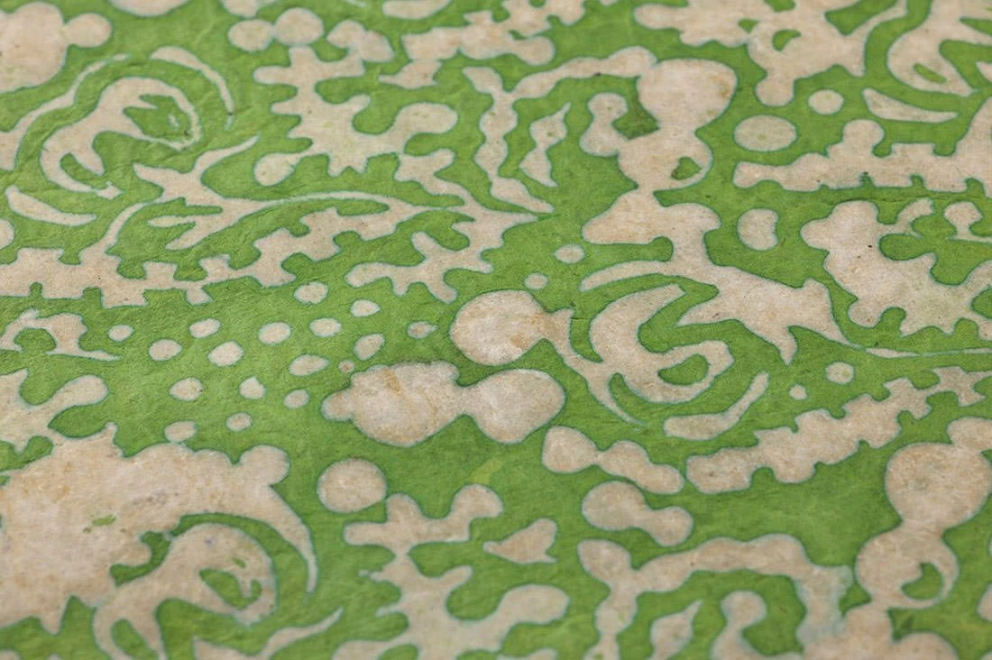 Der grüne Orient zieht durch diese einzigartige Ornamenttapete mit floralem Design in den Raum ein. Die hochwertige Handdruck-Papiertapete aus dem Hause Le Monde Sauvage, inspiriert von der indischen Batikkunst, lässt Wohnstile wie Shabby Chic oder Boho-Look frisch erblühen. Das reizende Maigrün des Musters auf dem beigefarbenem Fond ist ein Wandlungstalent, das sich den individuellen Lichtverhältnissen anpasst und verschiedene Gesichter zeigt. Bei Tageslicht präsentiert sich Sangpo als Symbiose aus frischem Wiesengrün, im Kunstlicht wie ein Wandschmuck im Märchenpalast des Sultans.