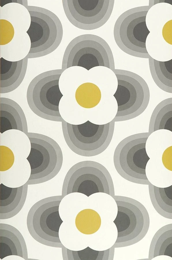 Flächige stilisierte Blumen sind das Markenzeichen der irischen Designerin Orla Kiely. Im Retro-Stil symmetrisch angeordnet, strahlen sie Klarheit und Ruhe aus. Die gelbgrünen Zentren der Blüten, umrahmt von Blättern in abgestuften Grautönen, ziehen den Blick magisch an. Die glatte Vliestapete verleiht Ihrem Raum Helligkeit und Freundlichkeit – mit einem individuellen Touch! „Selene“ erhalten Sie in drei weiteren Farbkombinationen.