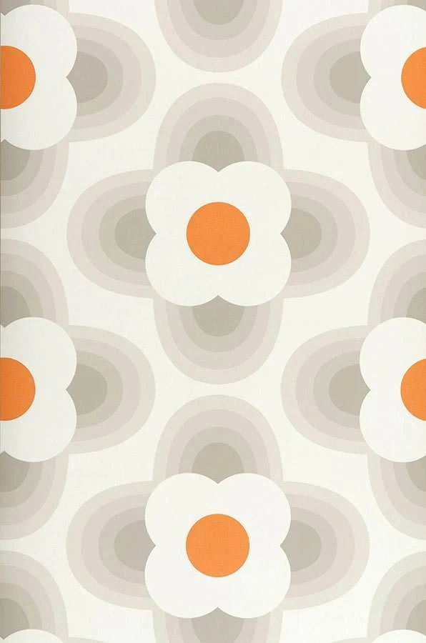 Helles Graubeige in verschiedenen Schattierungen kontrastiert mit kräftigem Orange und gibt den von Orla Kiely entworfenen stilisierten Blüten nebelhafte, verschwommene Konturen. Trotz der Klarheit der Formgebung scheinen die Blüten durch die Farbwahl ein Geheimnis zu wahren und harmonieren ideal mit aktuellen Schlammfarben und Taupe-Tönen. Das Retro-Design gibt es noch in drei weiteren, ganz unterschiedlich wirkenden Farbvariationen.