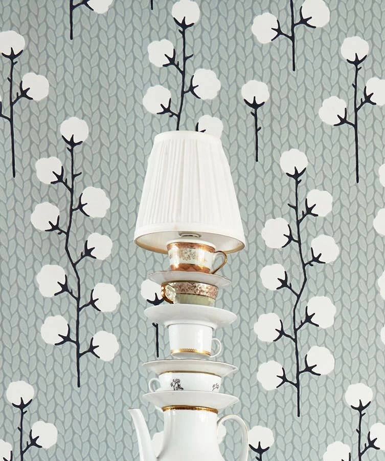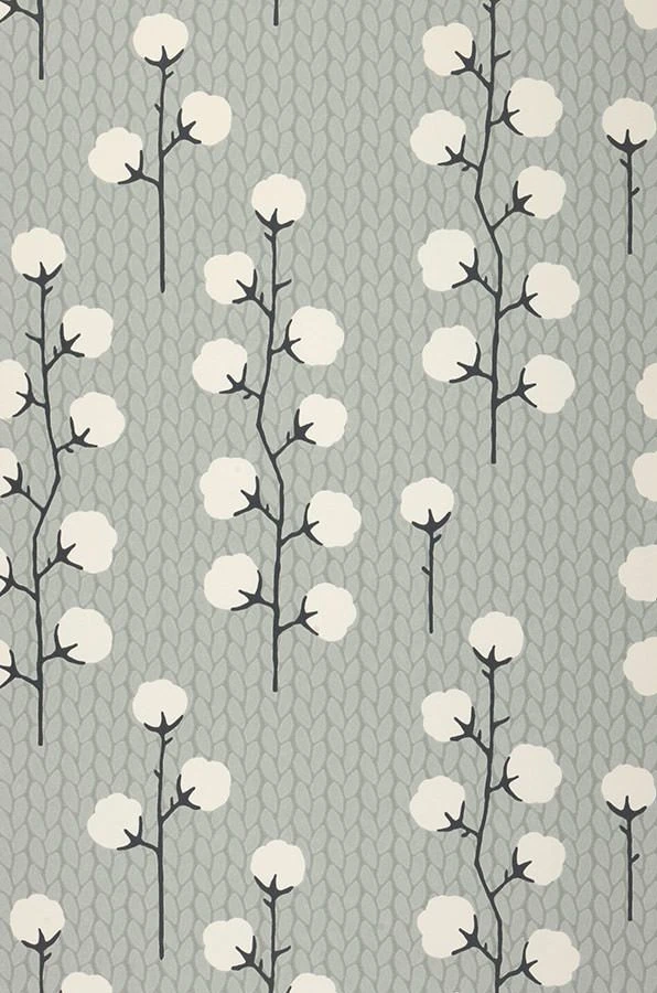 Die im Leimdruckverfahren hergestellte Tapete stammt von dem schwedischen Label Majvillan. Emporstrebende Baumwollpflanzen schmücken den Untergrund, der wie aus geflochtenen Zöpfen wirkt. Hier verbinden sich matte Grautöne mit Cremeweiß und Schwarzgrau.