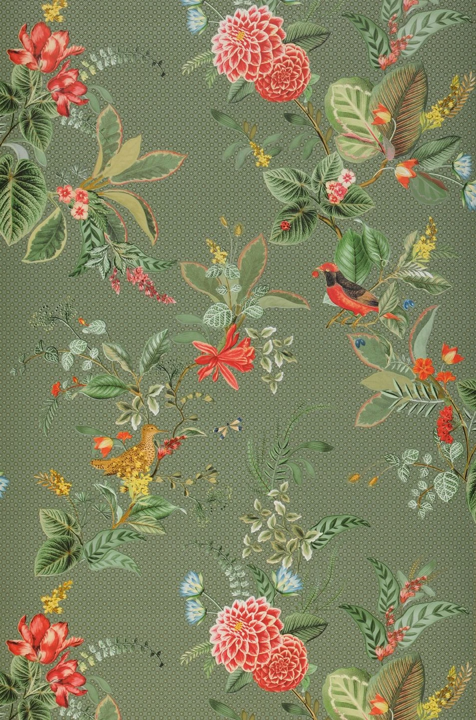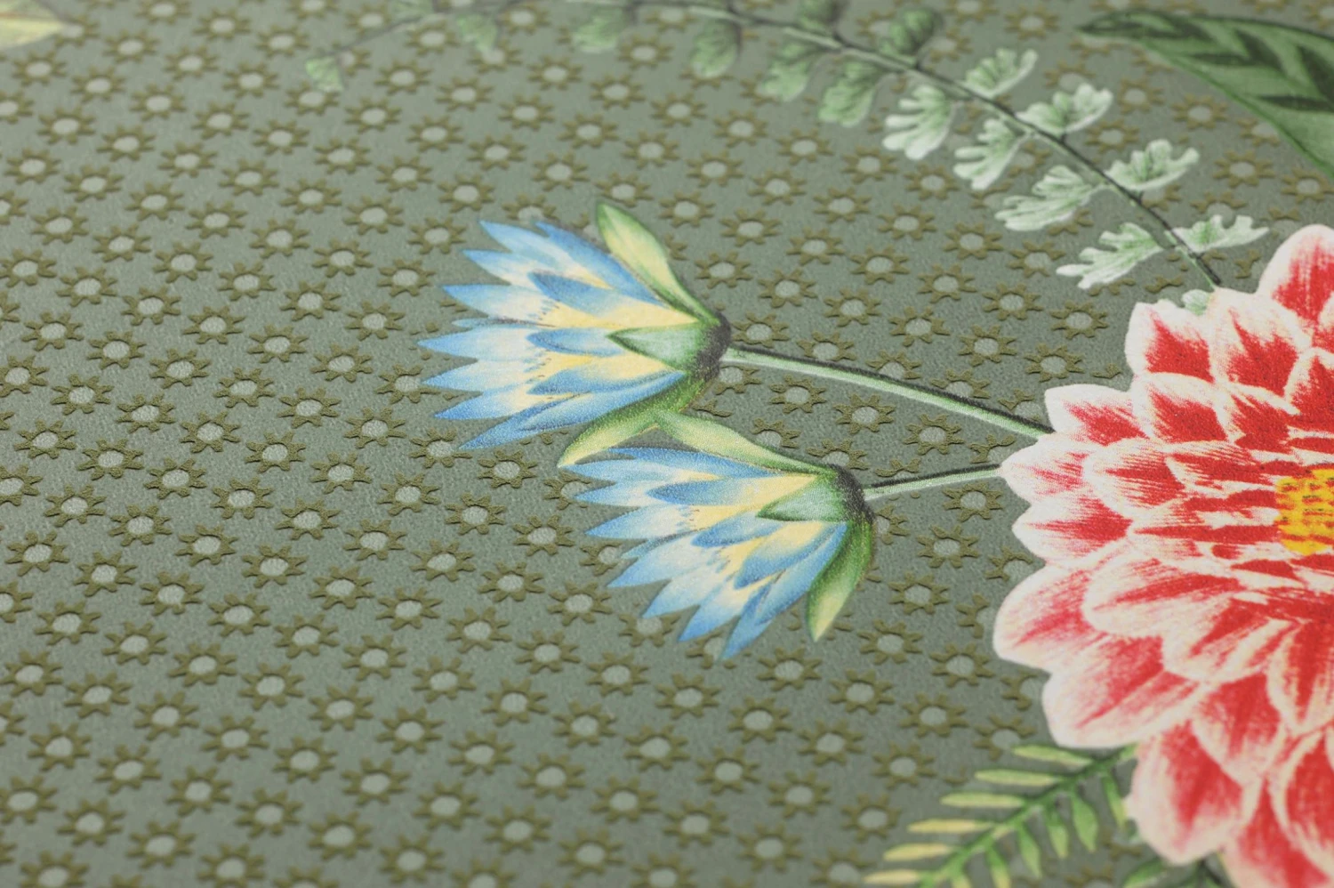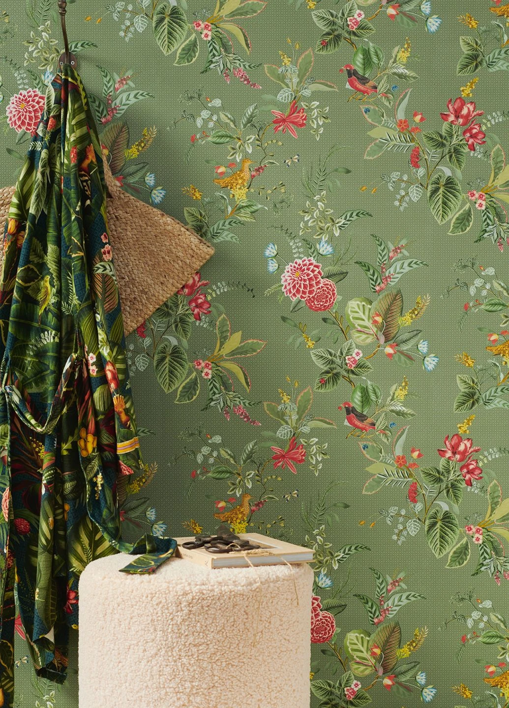 Die schönsten exotischen Blütenpflanzen wirken hier wie locker über die Tapete gestreut. Dazwischen tummeln sich bunte Vögel und Insekten. Das blasse Grün des Hintergrunds, aus dem die Blätter mit ihren hübschen Mustern hervortreten wie aus dem undurchdringlichen Dickicht eines Tropenwalds, bildet eine farblich passende Kulisse. Wer genau hinsieht, entdeckt darauf die fühlbar erhabene Struktur eines Musters, das die Tapete noch zusätzlich belebt.