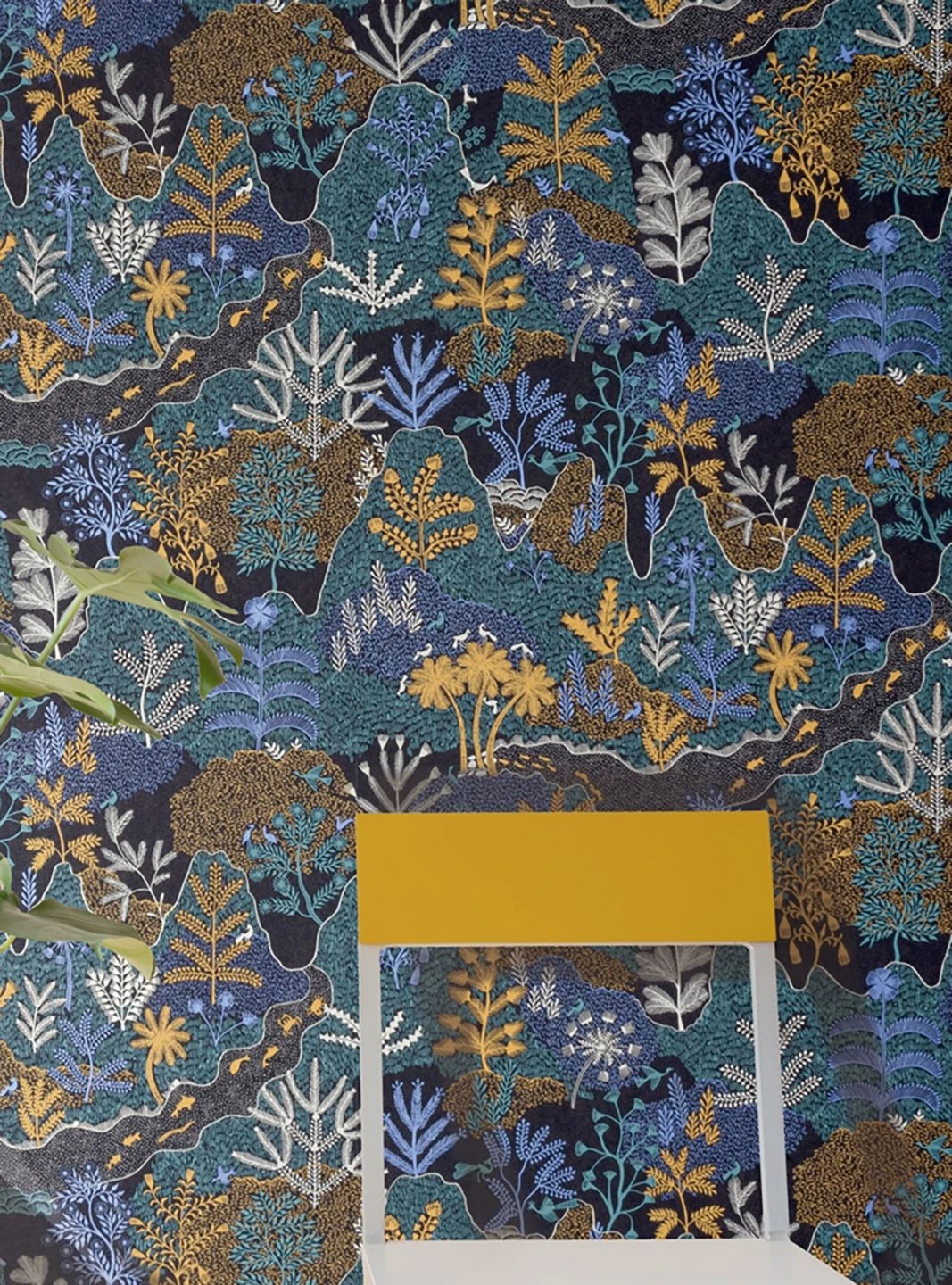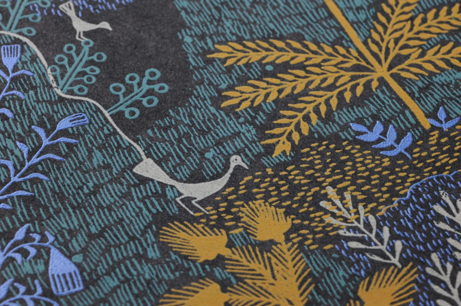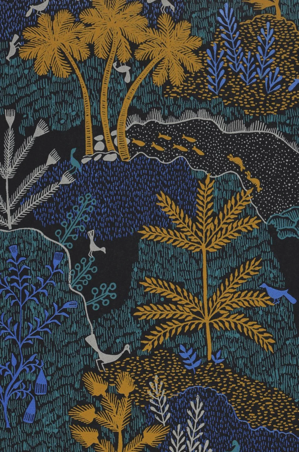 Feine Linien und Schraffuren in Grauweiß, Maisgelb, Perl- und Türkisblau setzen sich zusammen zu einer phantastischen exotischen Landschaft wie aus einem orientalischen Märchen. Zwischen Palmen und grasbewachsenen Hügeln gibt es Flüsse voller Fische, außerdem Blumen und Vögel. Die leuchtenden Farben kommen auf dem schwarzen Grund der Vliestapete eindrucksvoll zur Geltung und geben ihr eine magische Ausstrahlung.