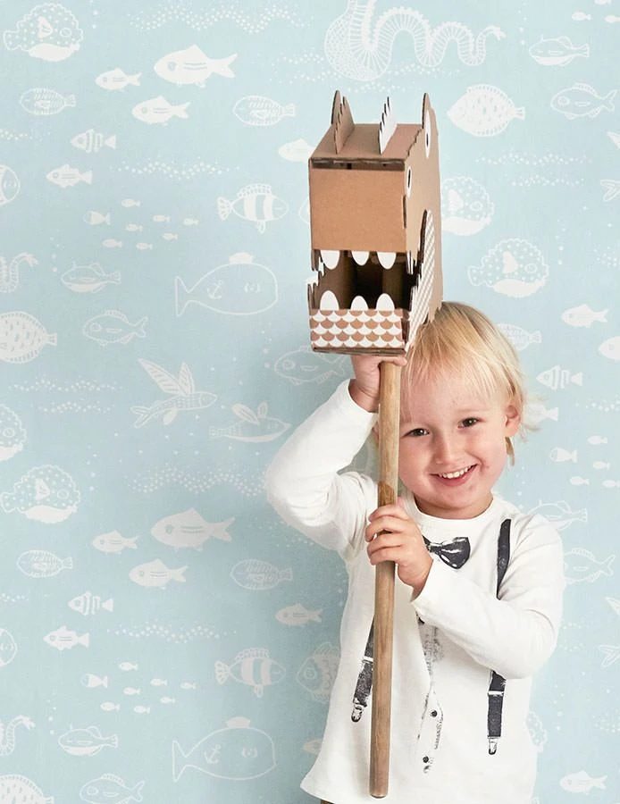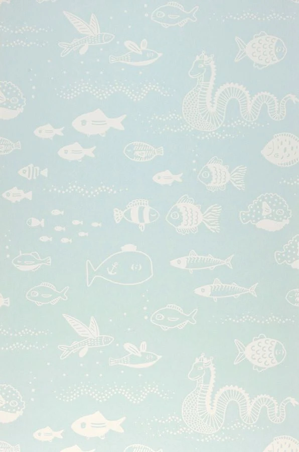 Pastelltürkis bildet das große Meer ab, in dem sich die weißen Silhouettenfische pudelwohl fühlen, wie die spritzigen Wasserbläschen beweisen. Die waschbeständige Kindertapete von Majvillan erschafft eine atmosphärisch kunstvolle Unterwasserwelt, die sich für thematische Raumgestaltung wunderbar anbietet.