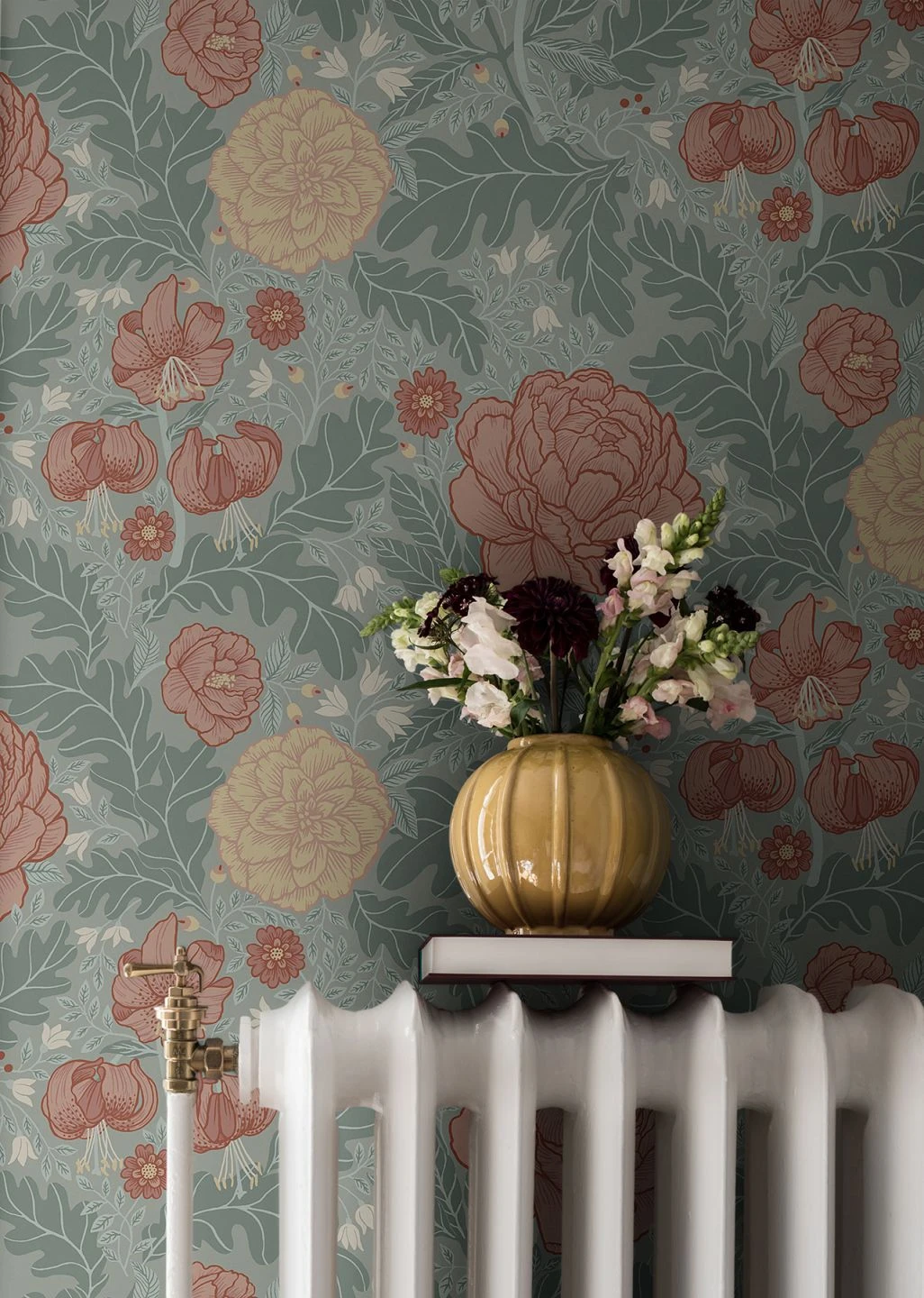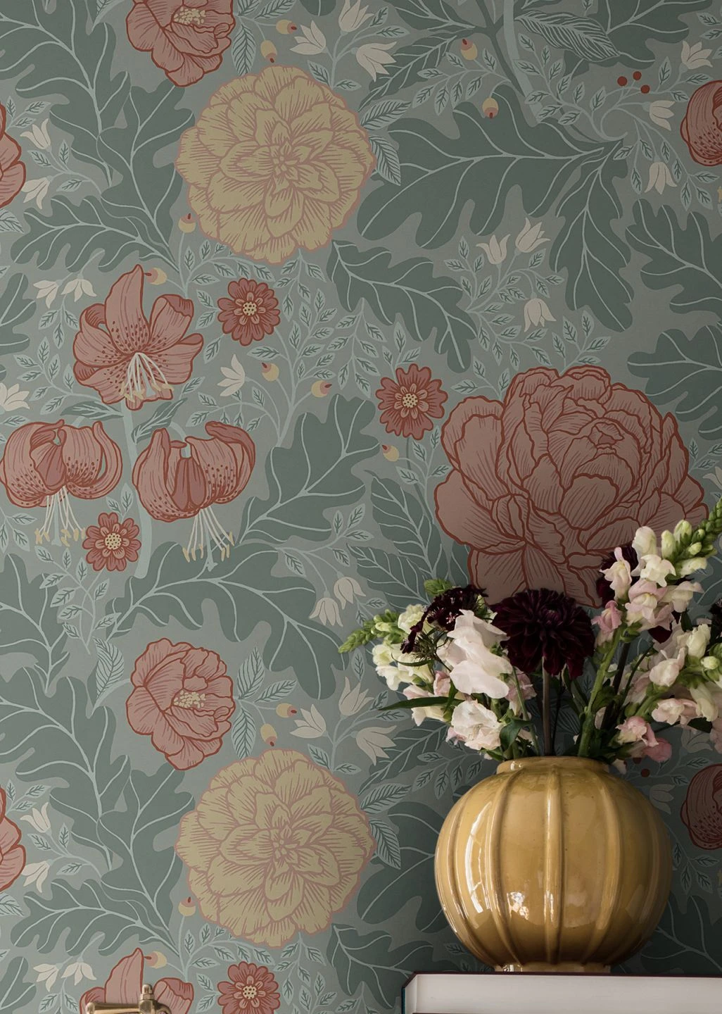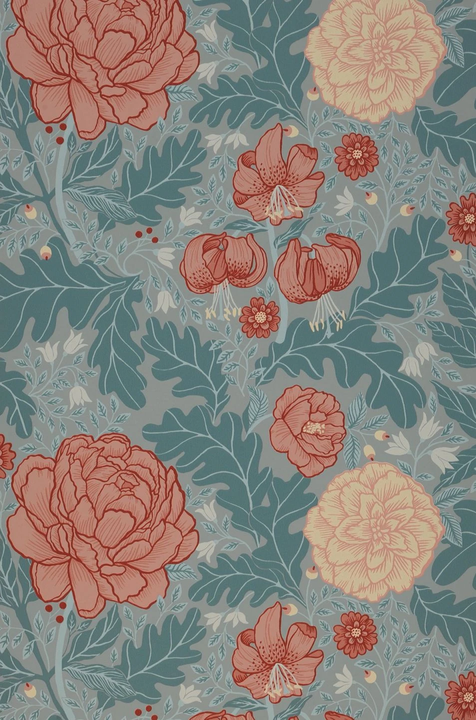 Das Design spielt raffiniert mit dem Effekt, dass die unterschiedlich großen und verschieden gefärbten Blüten und Blätter mehr oder weniger stark in den Vordergrund treten und einen Eindruck von räumlicher Tiefe erzeugen. Leuchtendes Rosa abgesetzt mit kräftigen braunroten Umrissen, blasses Gelb und Pastelltürkis heben sich unterschiedlich von der hellgrauen Grundfarbe ab. Die Vielfalt der Formen tut ihr Übriges für einen lebendigen und spannenden Raumeindruck.