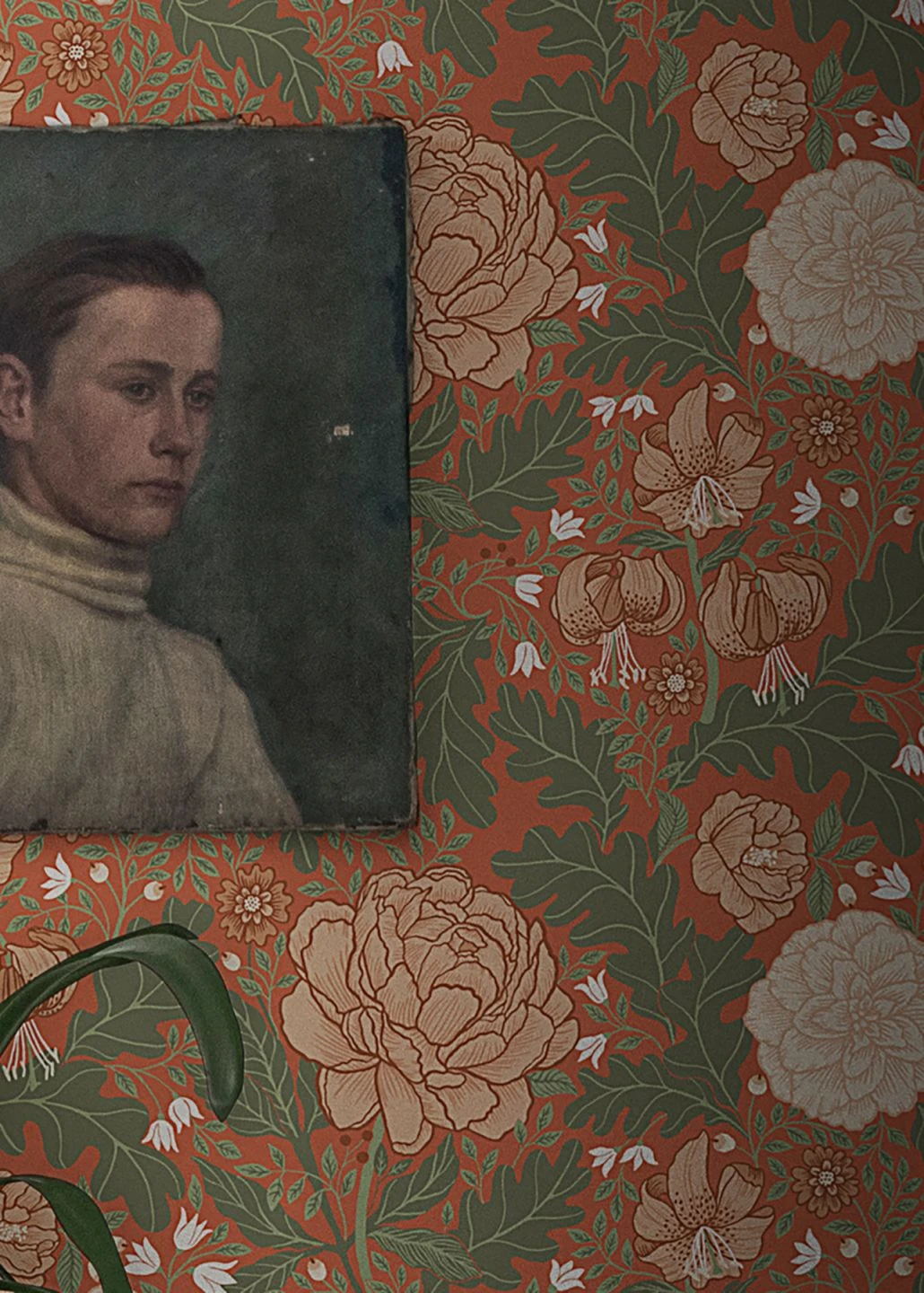 Vom kräftig rotorangefarbenen Hintergrund heben sich die Grüntöne der Blätter stark ab und bilden einen Kontrast zu den verschieden großen stilisierten Blüten, die in unterschiedlichen Schattierungen von Hellbeigerot, Orange und Weiß gehalten sind. Die lebhaften Farben harmonieren wunderbar mit dunklen Holztönen Ihrer Einrichtung, aber auch mit weißen oder cremefarbenen Elementen, und beleben Ihren Raum mit ihrer Wärme.