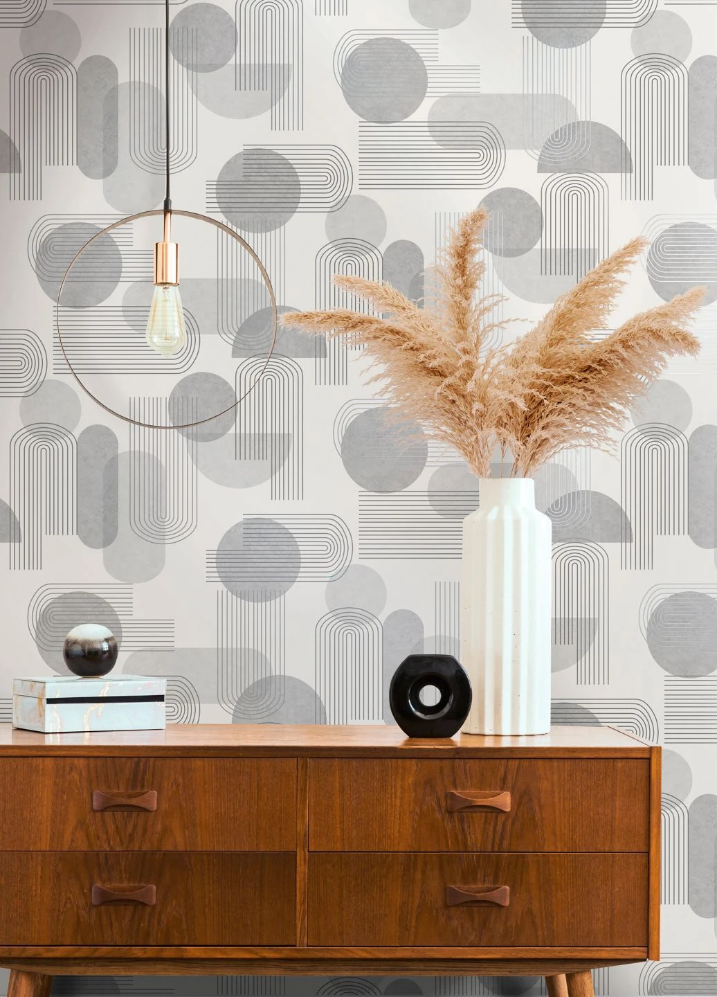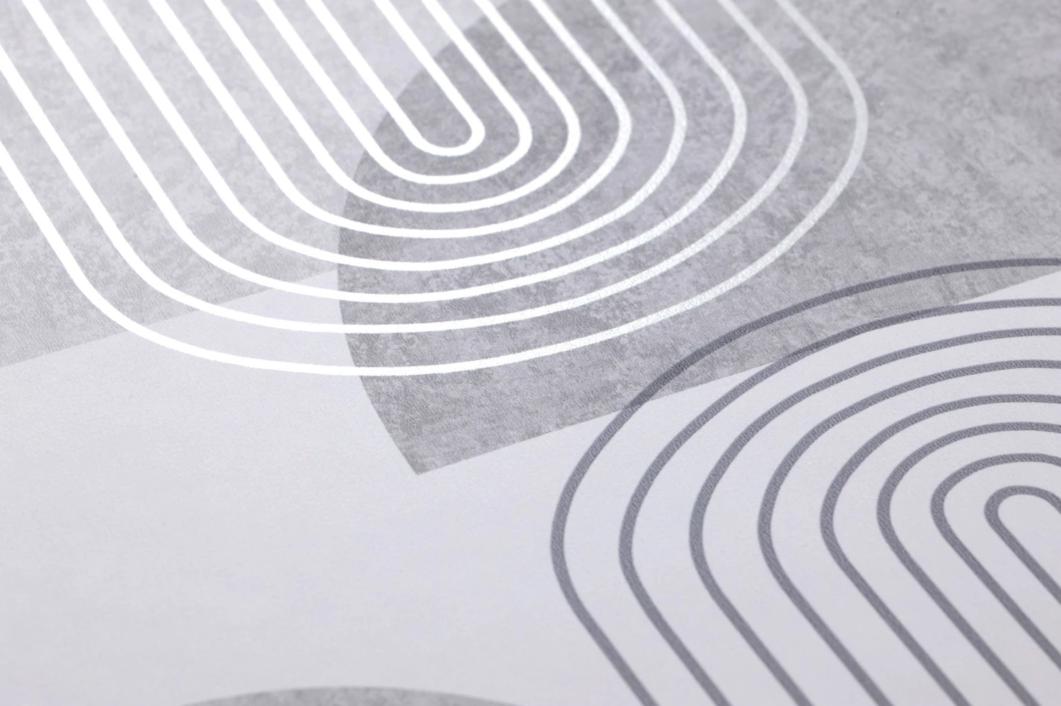 Hier bilden Farbe und Form eine perfekte Einheit: Kühle Grautöne und abstrakte Formen, wie sie aus der Ästhetik des Bauhaus stammen könnten, wirken zusammen und kreieren eine Tapete von zeitloser Eleganz. Silbern schimmernde Highlights sorgen für einen Hauch von Luxus. Die Papiertapete mit dem Retro-Schick ist ein toller Hintergrund für Möbel in den Non-Colors Weiß oder Schwarz. Aber auch mit ausgewählten Farbtupfern erzielen Sie eine beeindruckende Wirkung.