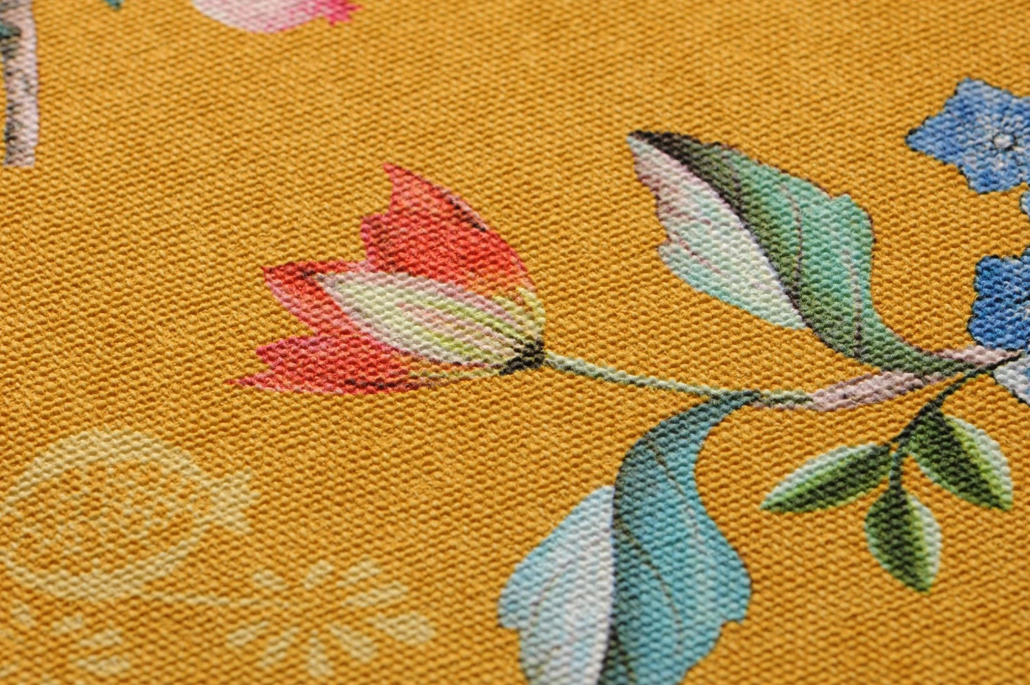 Die Tapete lebt von der Ausdrucksstärke der bunten Blumen, Vögel und Schmetterlinge, die teils in bunten, sorgfältig abgestuften Farben dargestellt, teils nur durch zarte Umrisse angedeutet sind, und der Strahlkraft des sonnengelben Untergrunds. Das Vinyl der Oberfläche hat eine gewebeartige Struktur und verleiht den Farben besondere Leuchtkraft. Es ist waschbeständig und kann durch seine Materialeigenschaften auch Ihr Badezimmer verschönern.