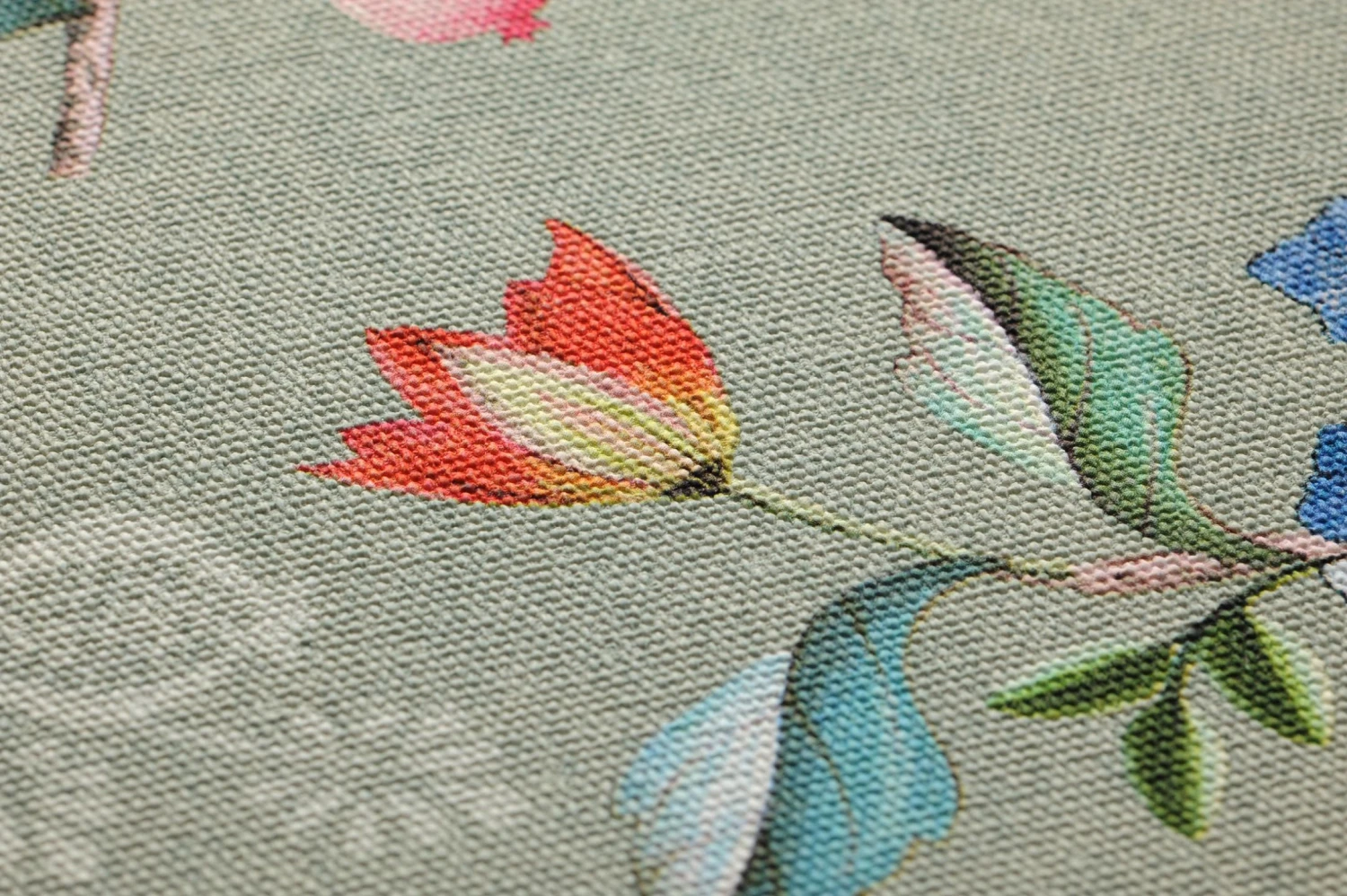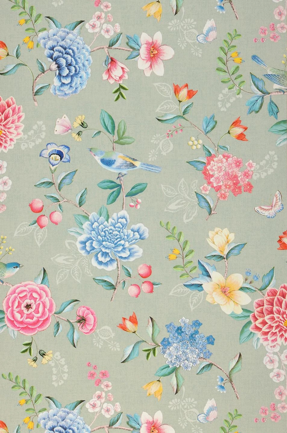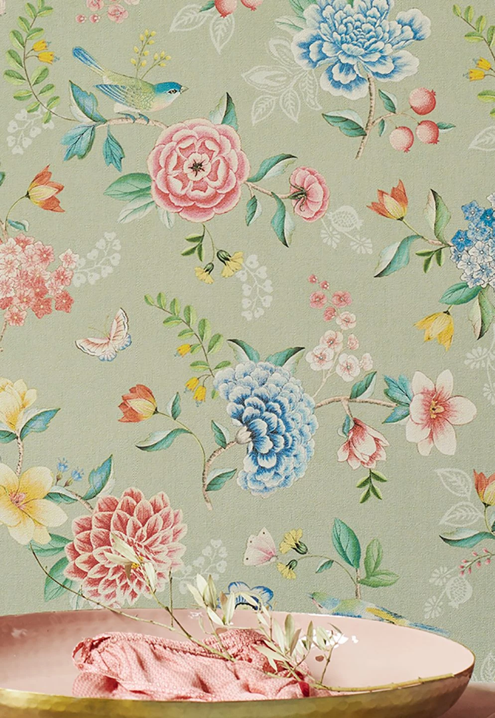 Die pastellgrüne Grundfarbe bildet einen perfekten Hintergrund für die Rosa-, Blau-, Grün- und Gelbtöne der Blumen, Blätter, Vögel und Schmetterlinge, die willkürlich über die Vliestapete verteilt scheinen und teils nur in feinen Umrissen angedeutet sind. Die Oberfläche der Tapete besteht aus Vinyl mit einer fühlbaren gewebeartigen Struktur. Sie ist auch für Ihr Badezimmer geeignet und lässt sich leicht reinigen.