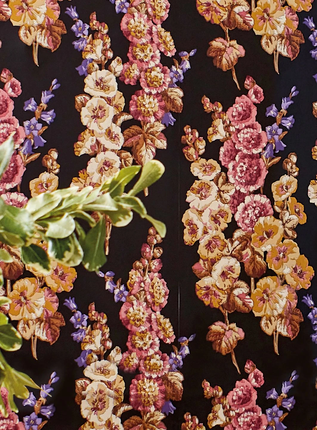 Die schwarze Grundfarbe dieser außergewöhnlichen floralen Tapete lenkt die ganze Aufmerksamkeit auf die leuchtenden Farben der Stockrosen, aus denen sich das elegante Muster zusammensetzt. Die kräftigen Rosa-, Violett-, Gelb- und Beigetöne scheinen auf dem dunklen Grund eine ganz eigene Leuchtkraft zu entwickeln. Besonders kostbar wirkt die Tapete durch das verwendete Leimdruckverfahren, das den Farbauftrag wie handgefertigt erscheinen lässt.