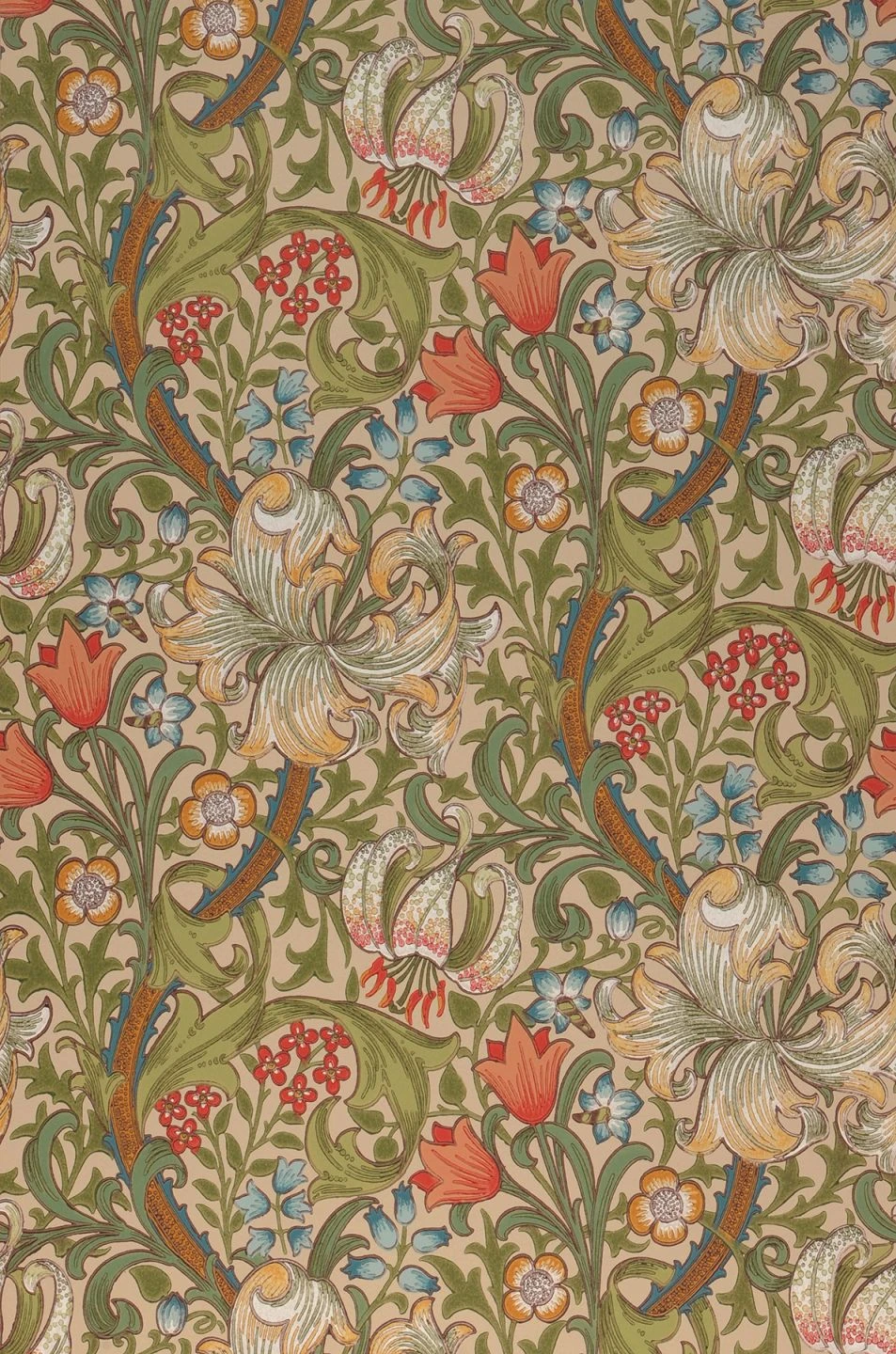 Das florale Renaissancemuster in Leimdruckoptik ist für stilvolle Räume gedacht, die eine sinnliche Gestaltung bevorzugen. Es verkörpert die Schönheit der französischen Bildwirkerei, die auch als Gobelin bekannt ist. So entsteht ein sehr haptischer warmer Eindruck, der durch die Farben Hellbeige, Grauweiß, Pastelltürkis, Rot und Grüntöne verstärkt wird.